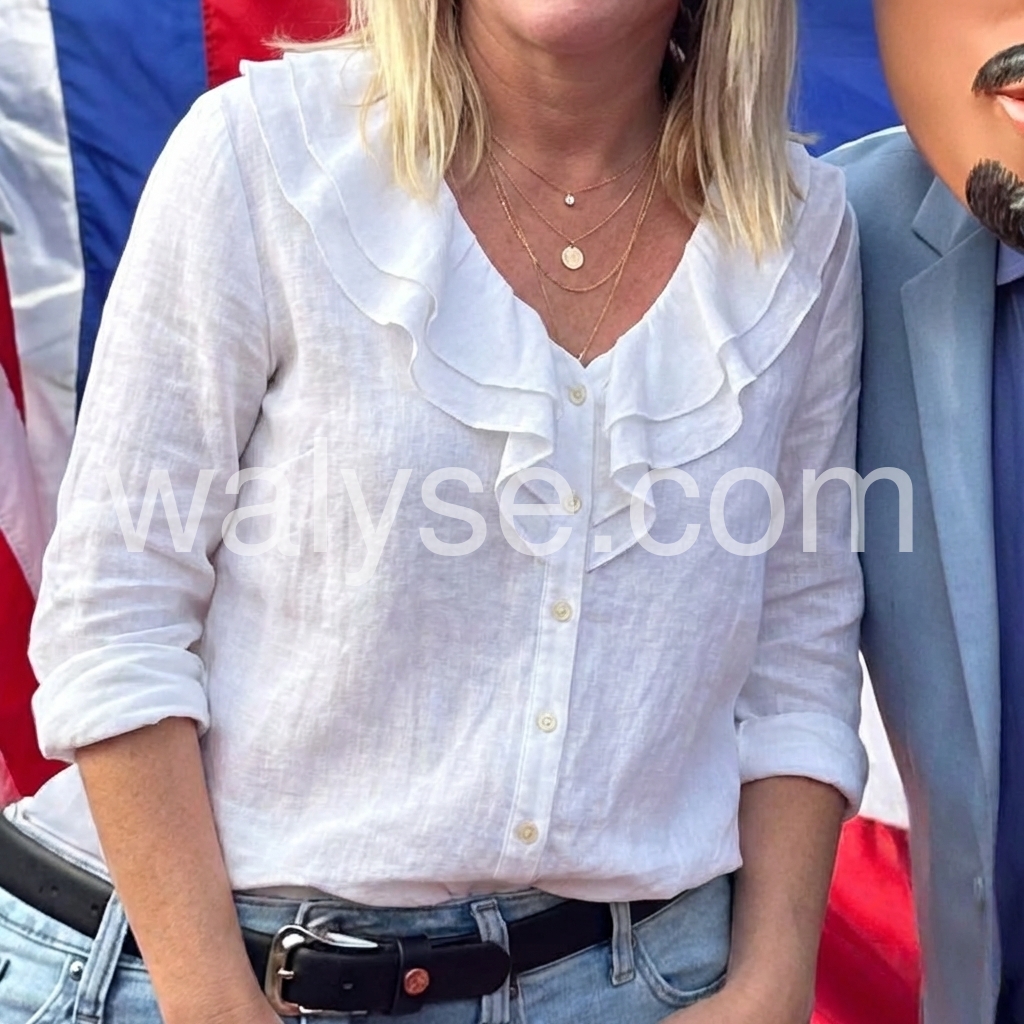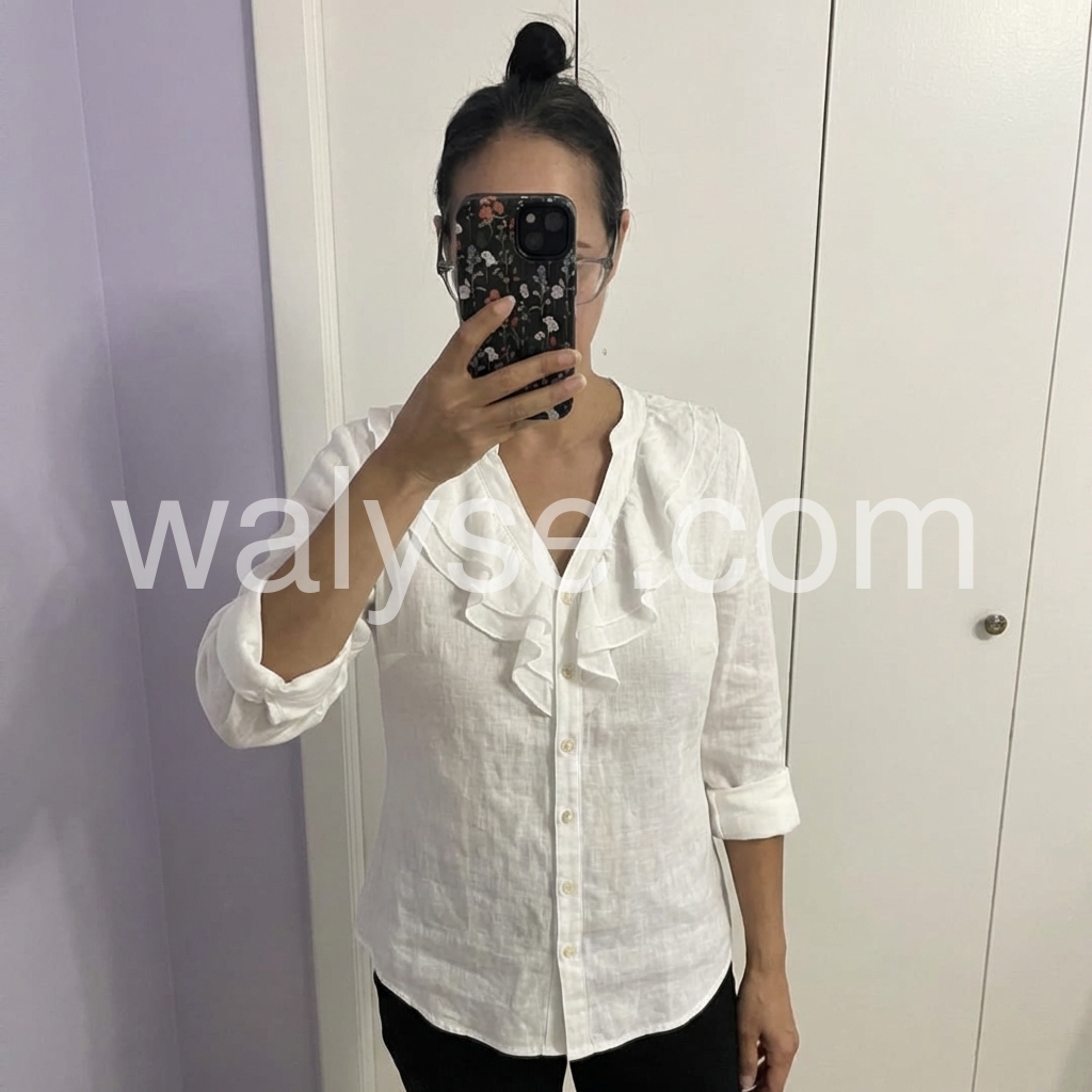 This white linen blouse features a delicate ruffled V-neckline and front button closure for a soft, romantic look. The lightweight fabric offers breathability and comfort, perfect for warm days. Rolled long sleeves add a relaxed touch, ideal for casual or semi-formal wear. Pair with jeans or tailored pants for effortless style. A timeless piece with a feminine flair.