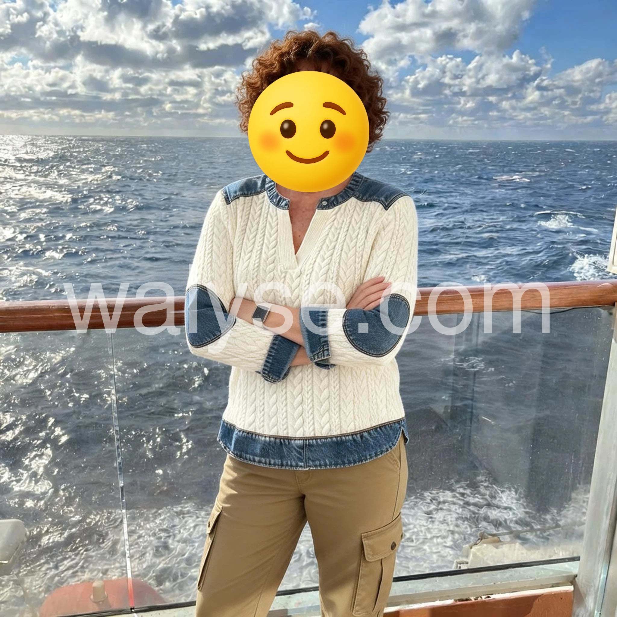 The denim detailing on the shoulders and hem elevates a classic knit into something modern and versatile. It's incredibly comfortable, fits true to size, and the V-neck adds a flattering touch without being too revealing. I'd pair it with skinny jeans or a midi skirt for weekends.