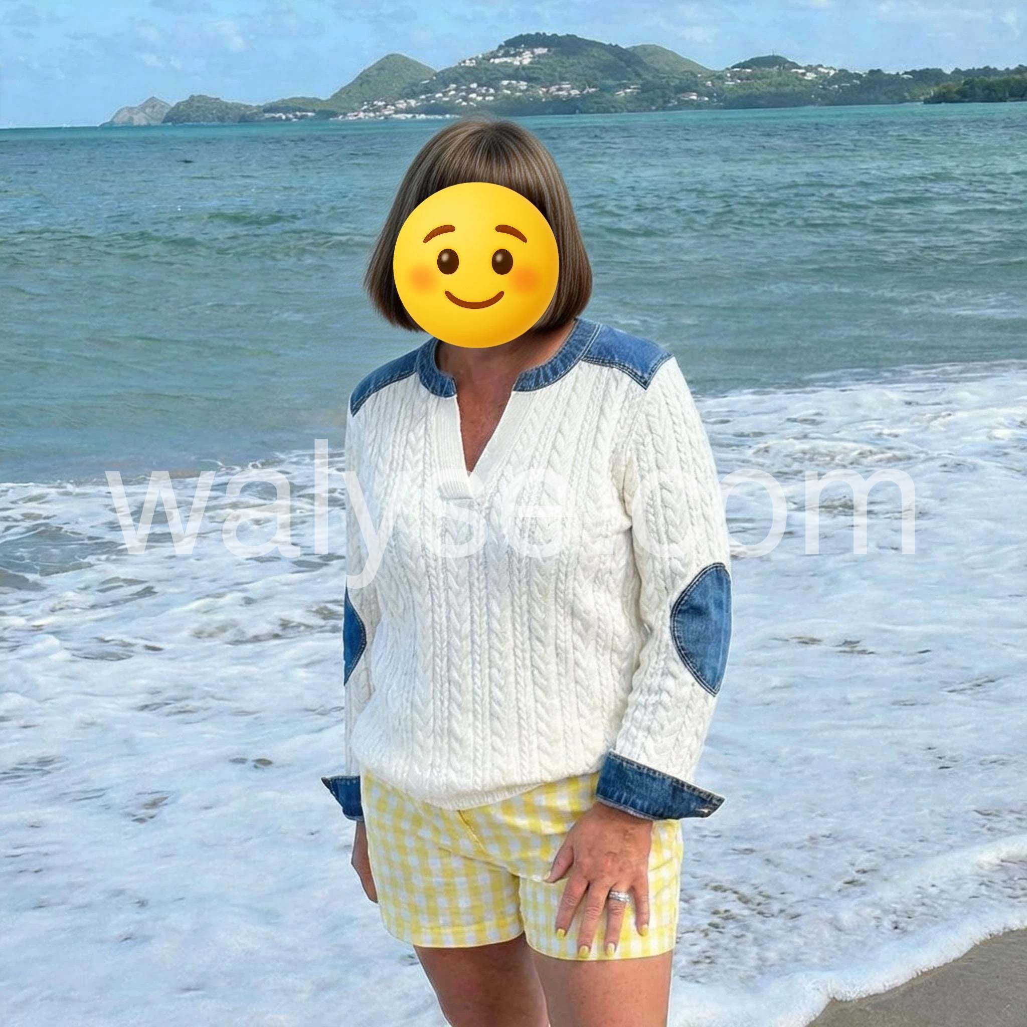 Bought this as a gift for myself and I am thrilled. The V-neck is very flattering and the cable knit design is classic. The denim elements give it an edgy twist. Arrived quickly and the packaging was great.