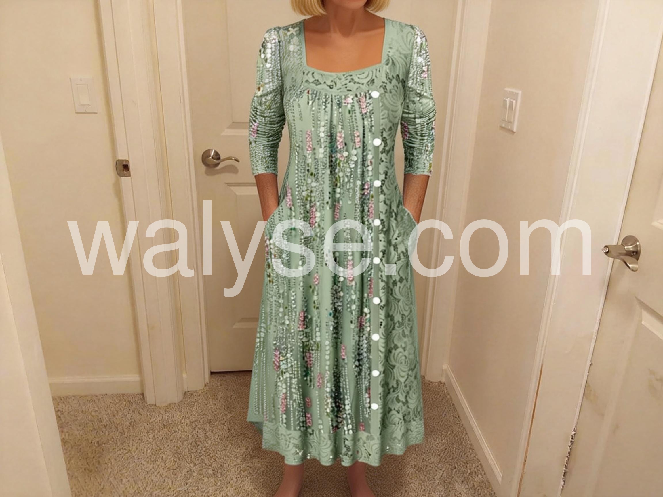 Imagine effortless elegance that turns heads at every glance. This fresh green midi dress captures modern sophistication with its architectural square neckline that frames the collarbone beautifully, paired with graceful long sleeves for refined polish. The A-line silhouette flows with understated grace, while the luxurious rayon-elastane blend moves like silk against your skin—stretchy enough for all-day comfort, yet structured enough to maintain its impeccable shape. Practical side pockets add a touch of everyday luxury, while the midi length strikes the perfect balance between timeless and contemporary. Whether you're navigating the office, attending weekend brunches, or stepping into evening plans, this dress adapts seamlessly to your lifestyle. Machine washable for effortless care. Discover the dress that makes you feel as good as you look.