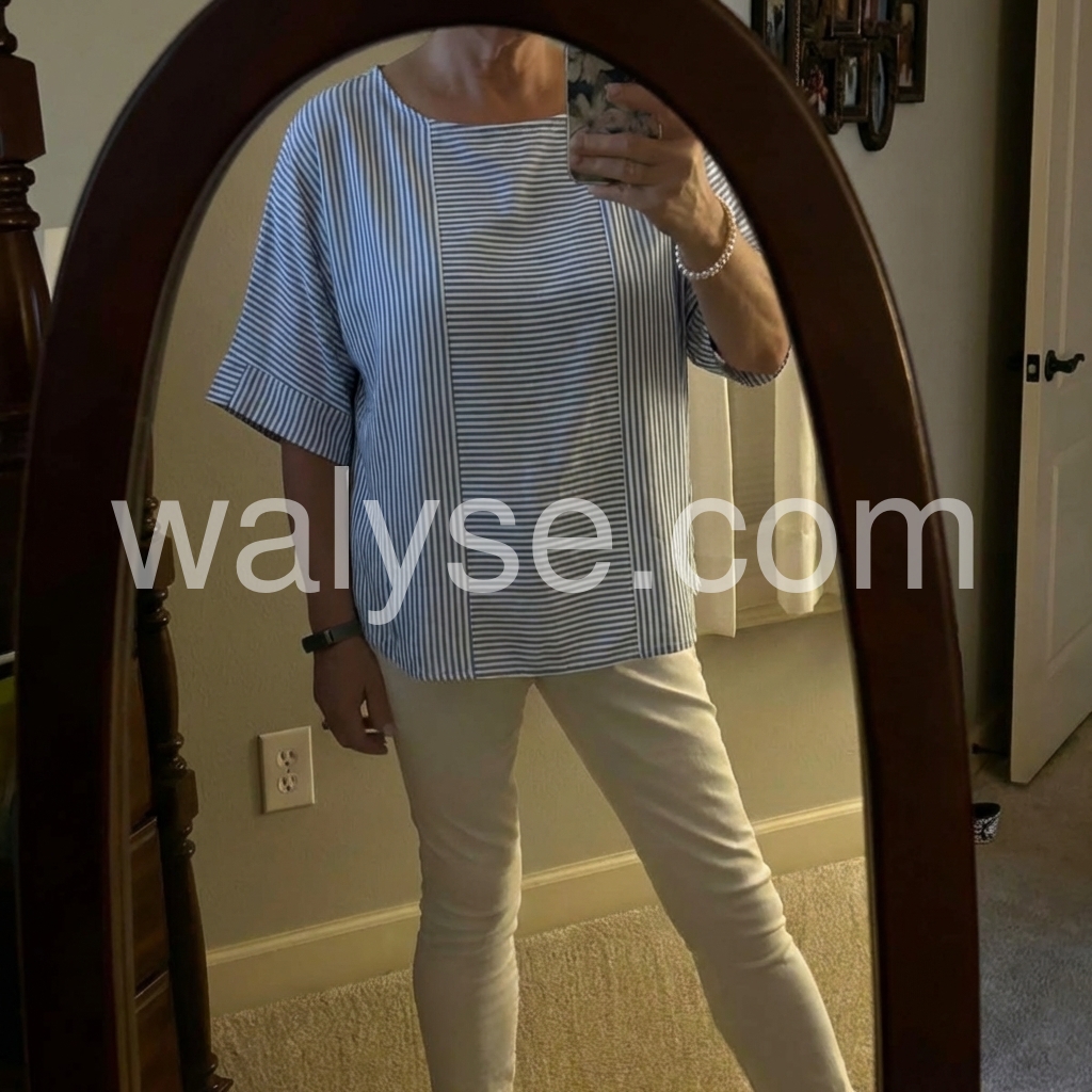 I created this blouse to solve the "boring striped top" pain point. The batwing sleeves hide arm fat, while the vertical stripe panel slims the torso, creating a flattering silhouette.