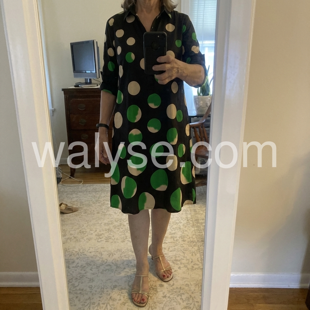 I bought this for a Mediterranean cruise and it was absolutely perfect! The fabric is lightweight and breathable, and the unique green and tan polka dots really stand out. Plus, it has pockets! Highly recommend for any summer vacation.