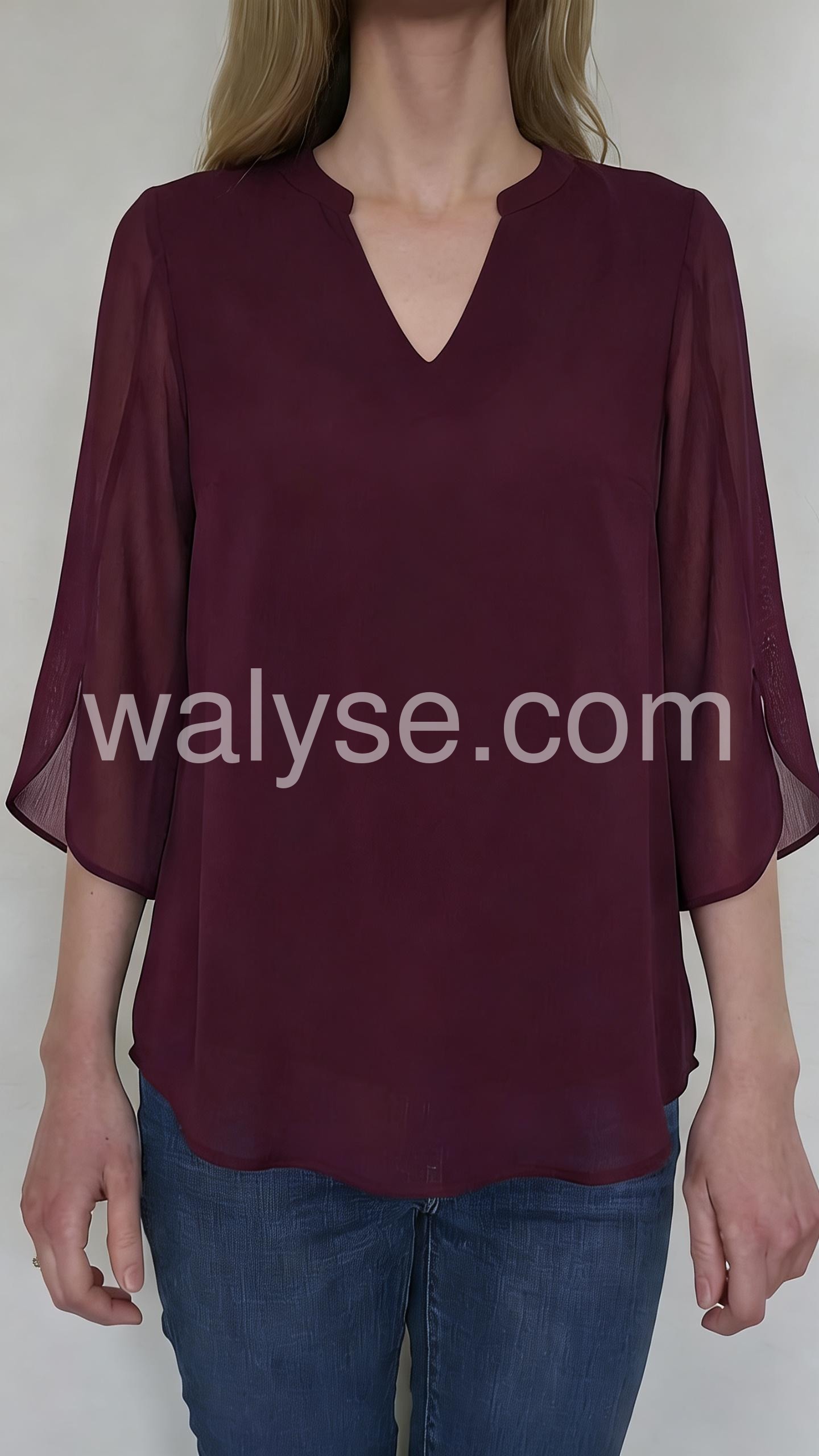 This V-neck blouse features a lightweight, sheer chiffon fabric with a soft drape. The three-quarter flutter sleeves add a feminine touch. Perfect for pairing with pants or jeans. Ideal for casual outings or dressy occasions. Effortlessly stylish and comfortable.