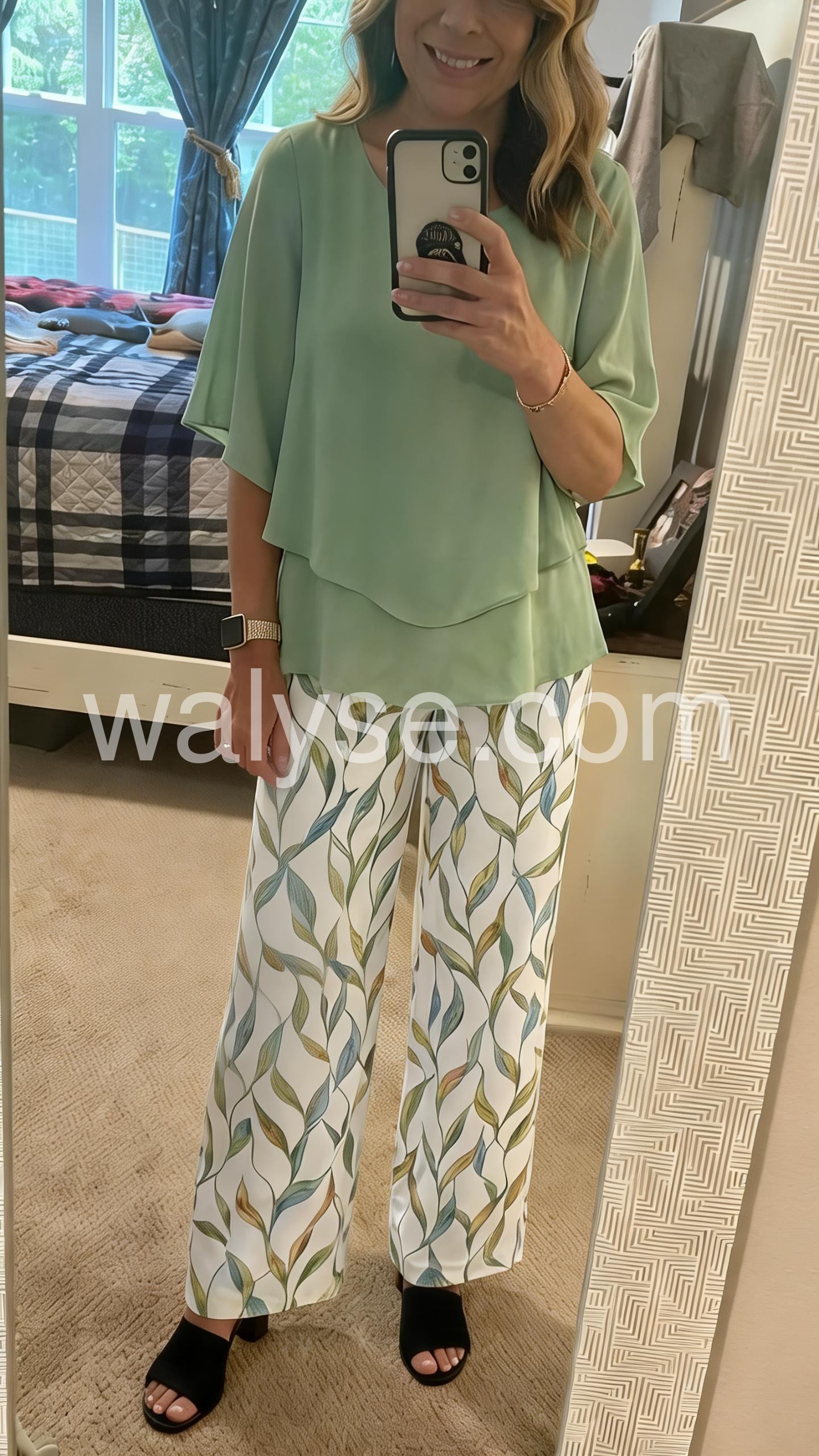 I bought this set for a summer cruise and it was absolutely perfect! The green layered top is very flattering and hides any tummy issues, while the leaf print pants are incredibly comfortable. Highly recommend for vacation wear.
