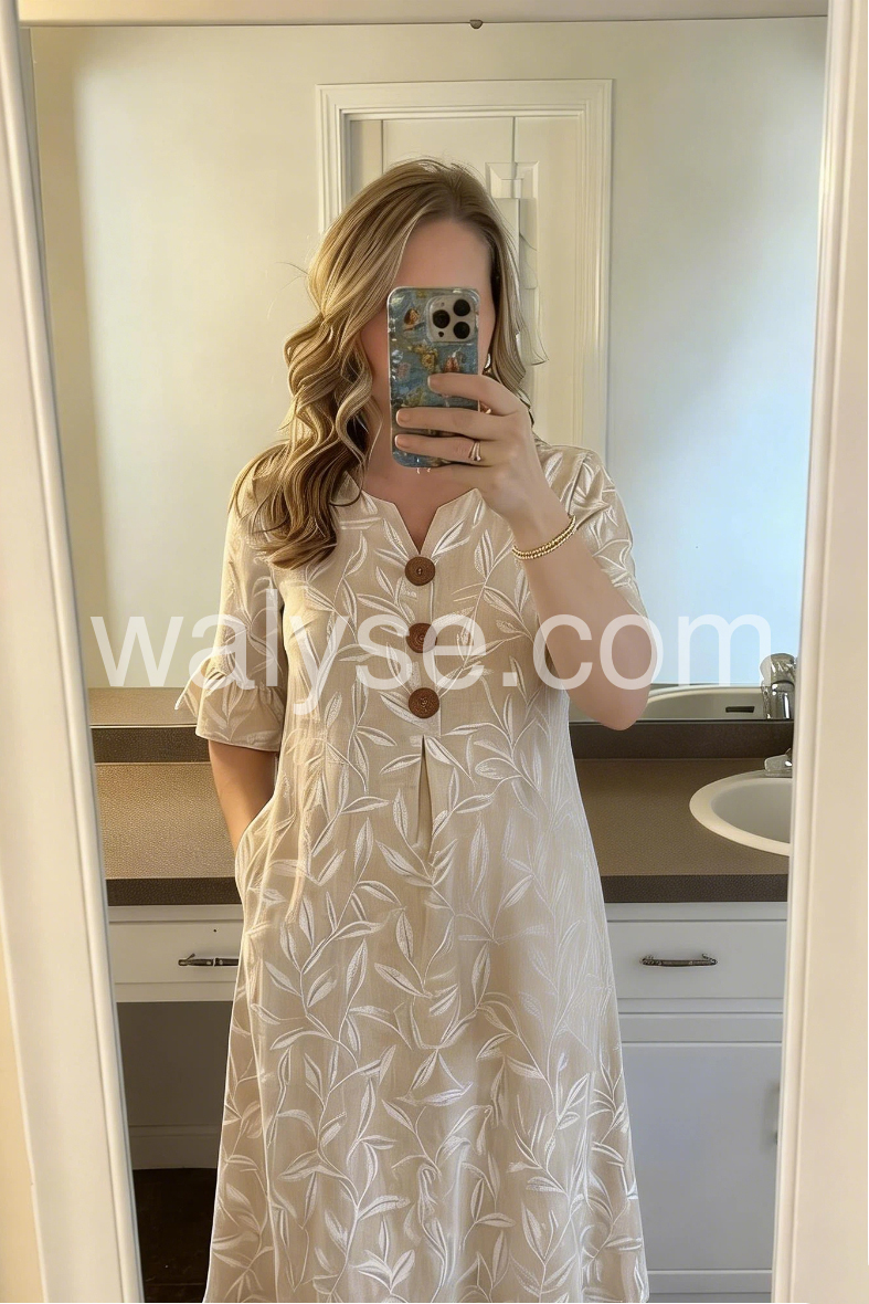 This flowy midi dress features a soft beige base with white leaf patterns. V-neckline with wooden buttons and flared sleeves for a relaxed look. Lightweight fabric perfect for warm weather. Ideal for beach outings or casual days. Effortlessly stylish and comfortable.