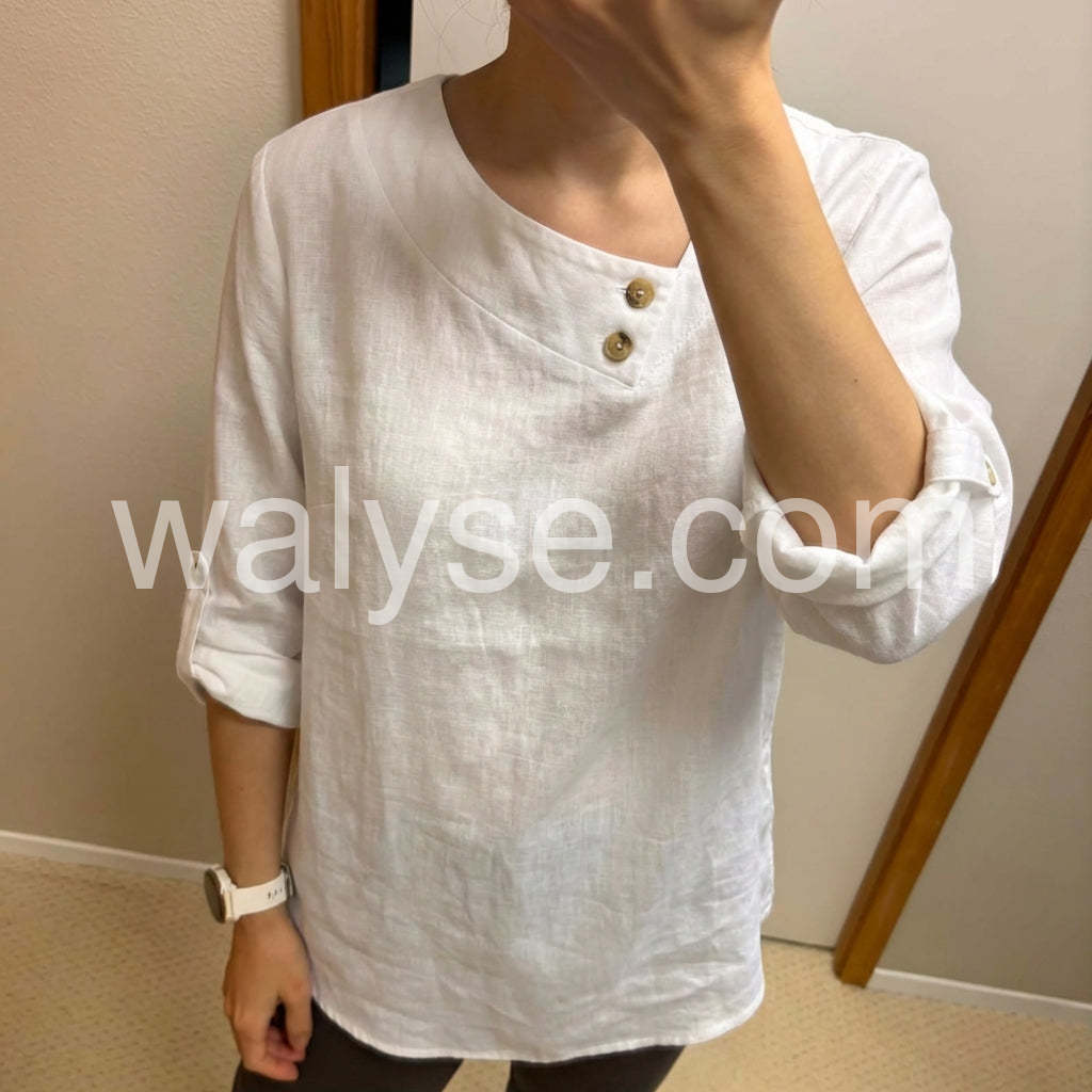 Absolutely love this top! The asymmetrical neckline with the buttons gives it such a unique touch compared to standard plain white tees. It fits perfectly and is incredibly comfortable for all-day wear.