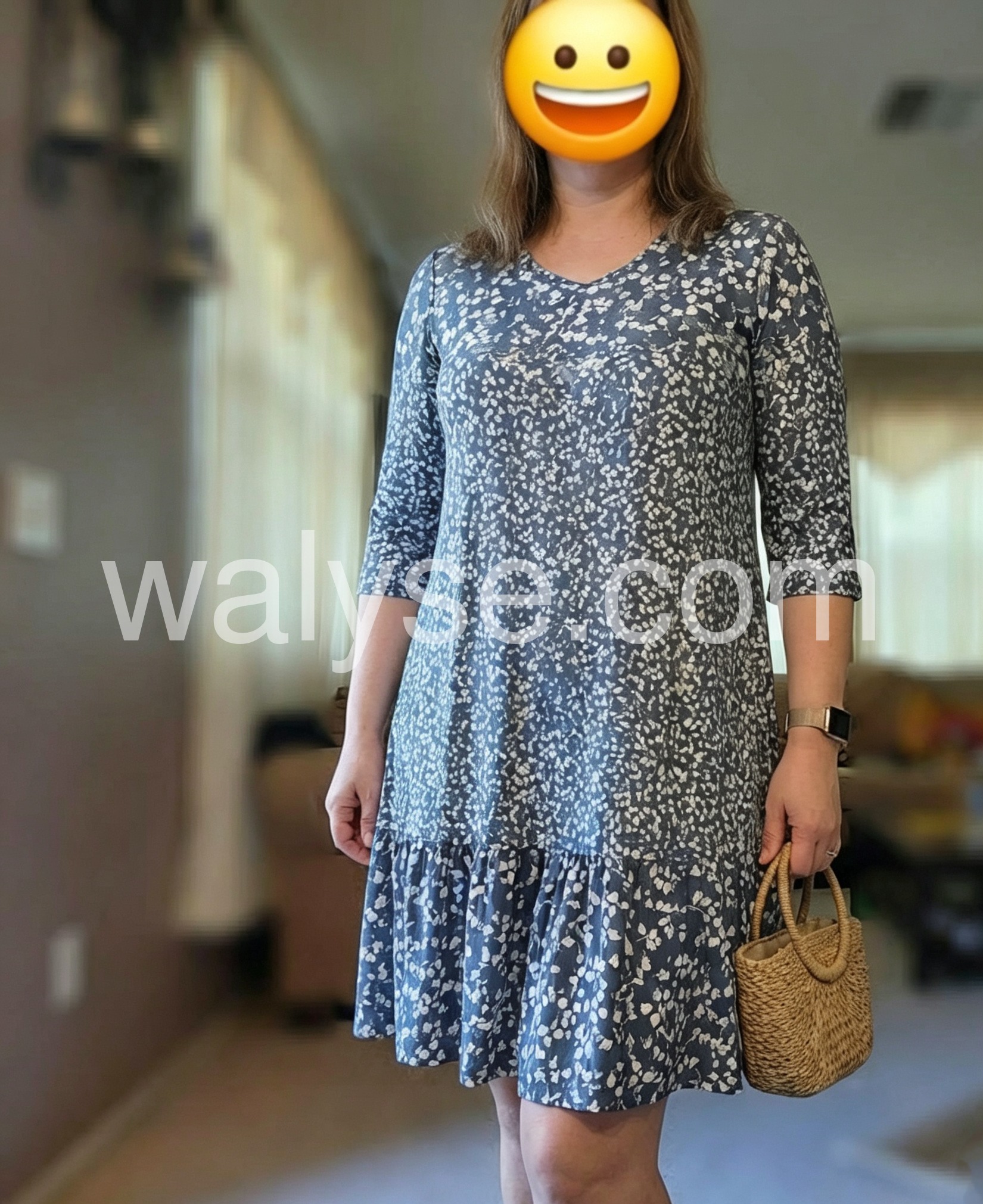 Blue White Floral Print V-Neck 3/4 Sleeve Ruffle Hem Dress