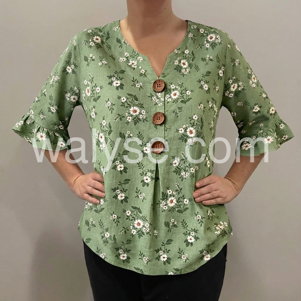 The V-neckline is flattering on all face shapes, and the ruffled three-quarter sleeves add a playful touch while hiding upper arms. The lightweight, breathable fabric is comfortable for all-day wear.