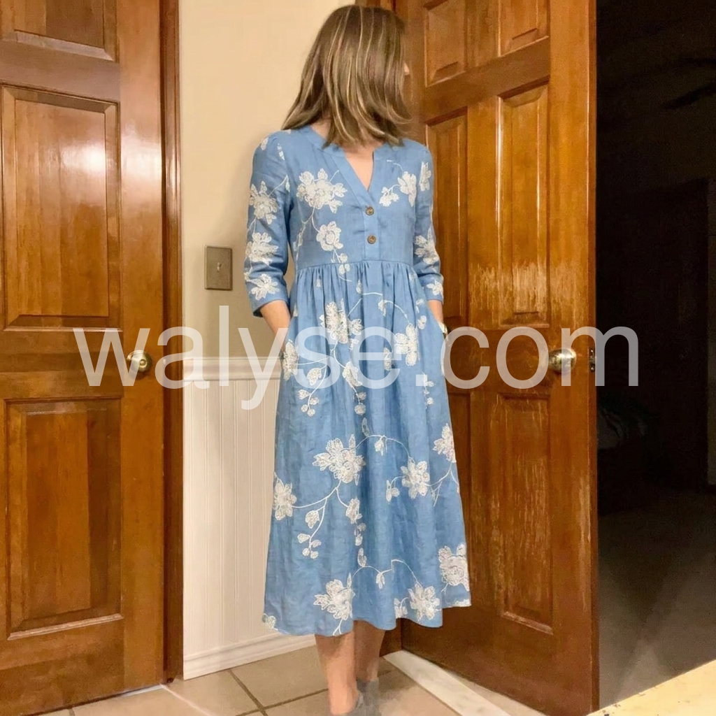 Crafted to solve the "plain linen dress" pain point, this dress is adorned with intricate floral embroidery that adds artistry to everyday wear. The V-neck flatters the bust, while the pleated waist cinches without squeezing.
