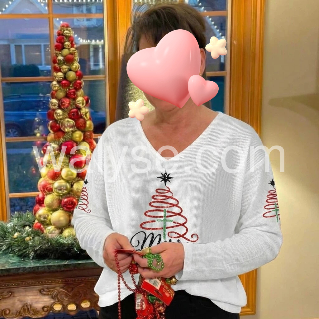 I love this Christmas sweatshirt! The white fabric feels soft and comfortable, and the “Merry Christmas” design with the trees looks festive and well made. The V-neck is flattering and the fit is just right—not stiff or scratchy. It’s perfect for the holiday season and matches the photos exactly. Great quality for the price.