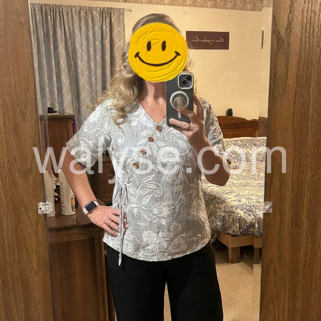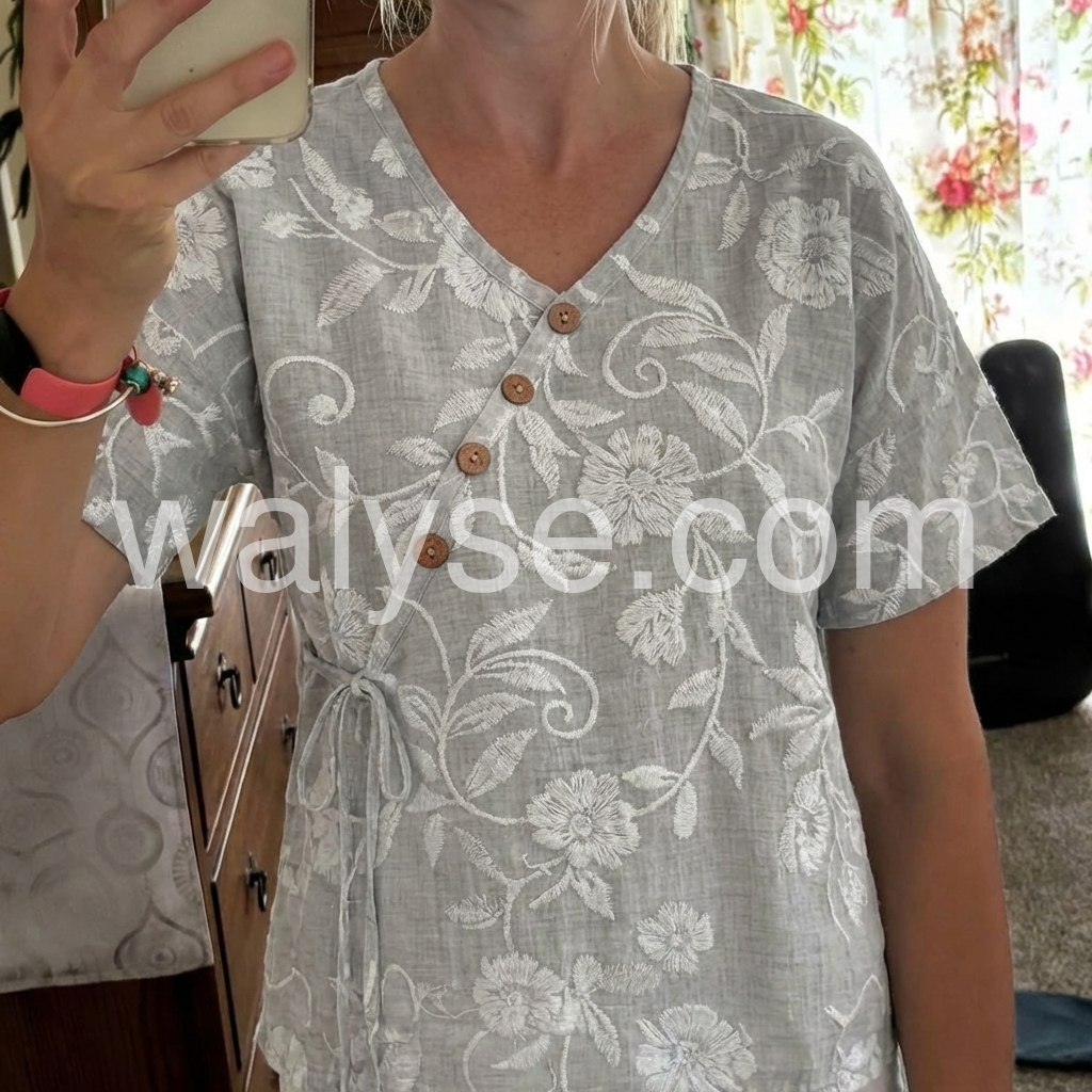 This short-sleeve top features a soft gray base with white floral print. V-neckline with wooden buttons and side tie detail. Relaxed fit for all-day comfort. Lightweight fabric perfect for casual wear. Ideal for pairing with jeans or pants.