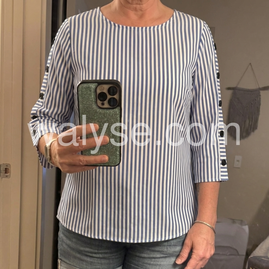 Great quality and style. The vertical stripes are very slimming, and the three-quarter sleeves hit right at the perfect spot. I paired it with white dress pants just like the model and received so many compliments at work.