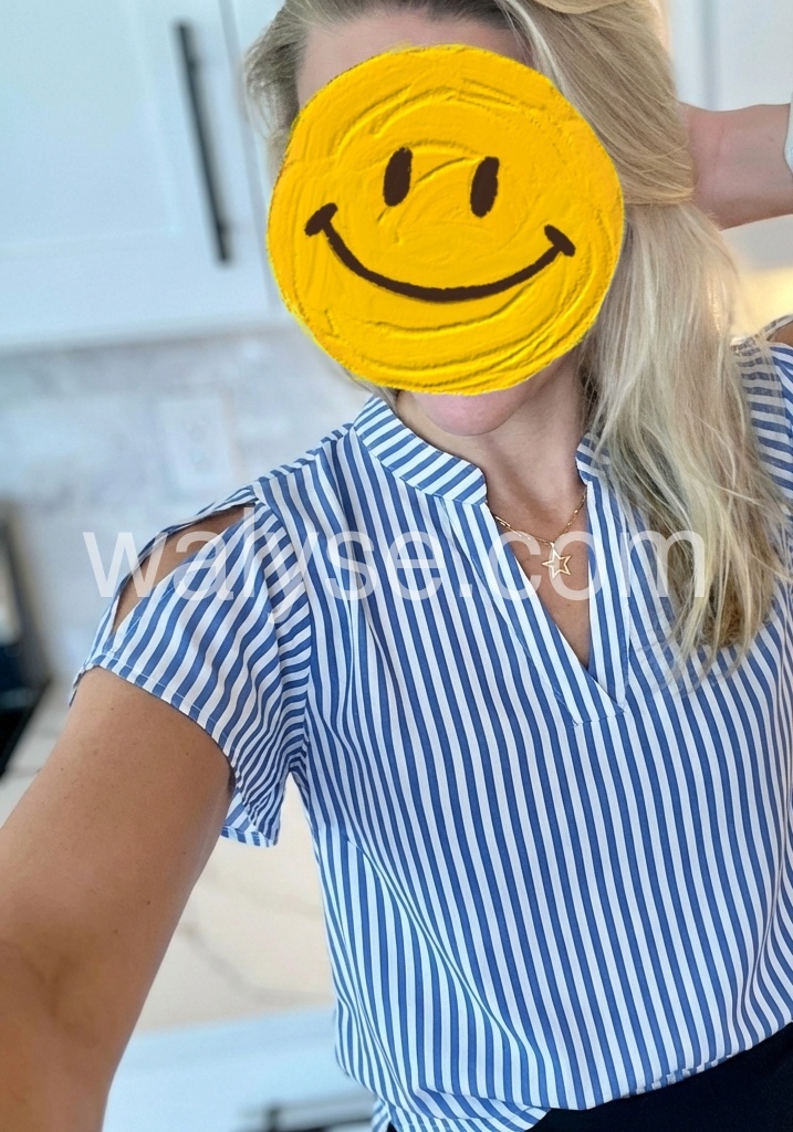 This short sleeve top features vertical blue and white stripes. Collar design with a V-neckline for a polished look. Cut-out shoulders add a trendy touch. Lightweight fabric perfect for summer wear. Ideal paired with jeans or shorts.
