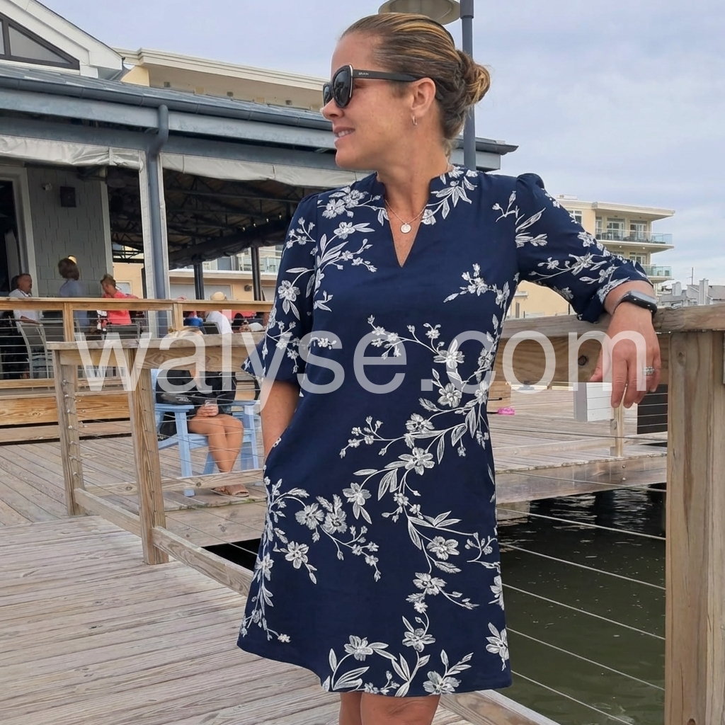 Enjoy effortless elegance with this navy floral dress. It features delicate white blooms and flared 3/4 sleeves, adding a romantic touch to the classic shift style.