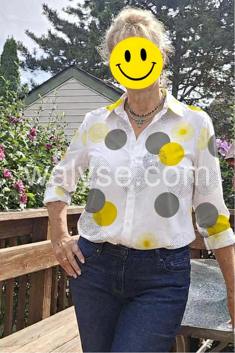 Love the geometric pattern! The yellow and grey circles pop so nicely against the white. It is perfect for casual Fridays at the office. The material feels lightweight but not see-through. Definitely recommend!