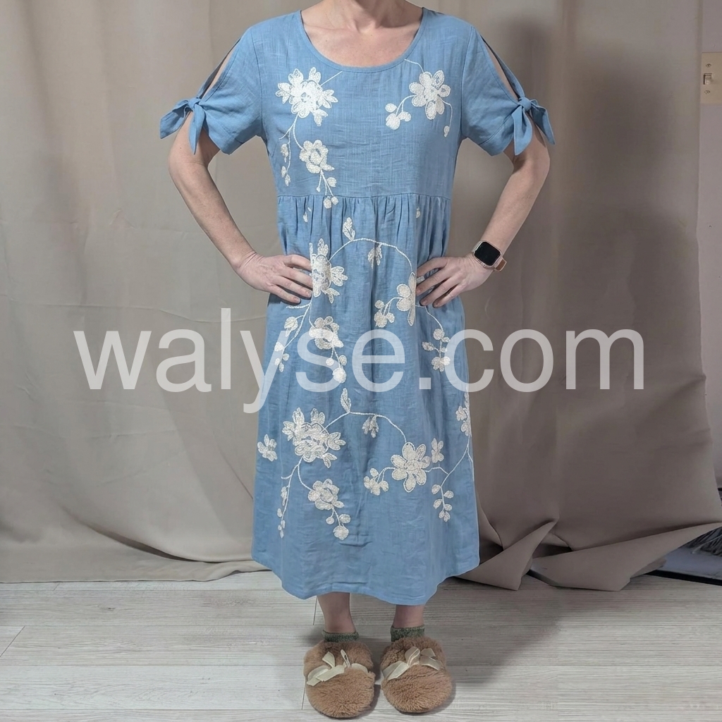 Designed to fix the "boring summer dress" pain point, this dress features intricate floral embroidery that elevates basic linen. The tie sleeves solve the "arm fat" concern, while the flowy tiered hem skims over hips and thighs.