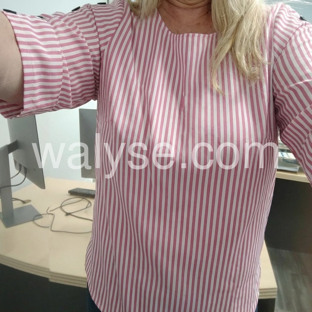 his loose-fit top features vertical pink and white stripes with stylish button details on the sleeves. Three-quarter sleeves with rolled cuffs offer a relaxed look. Round neckline for a clean, comfortable fit. Perfect for casual wear or smart-casual outfits. Bright and cheerful with a touch of elegance.