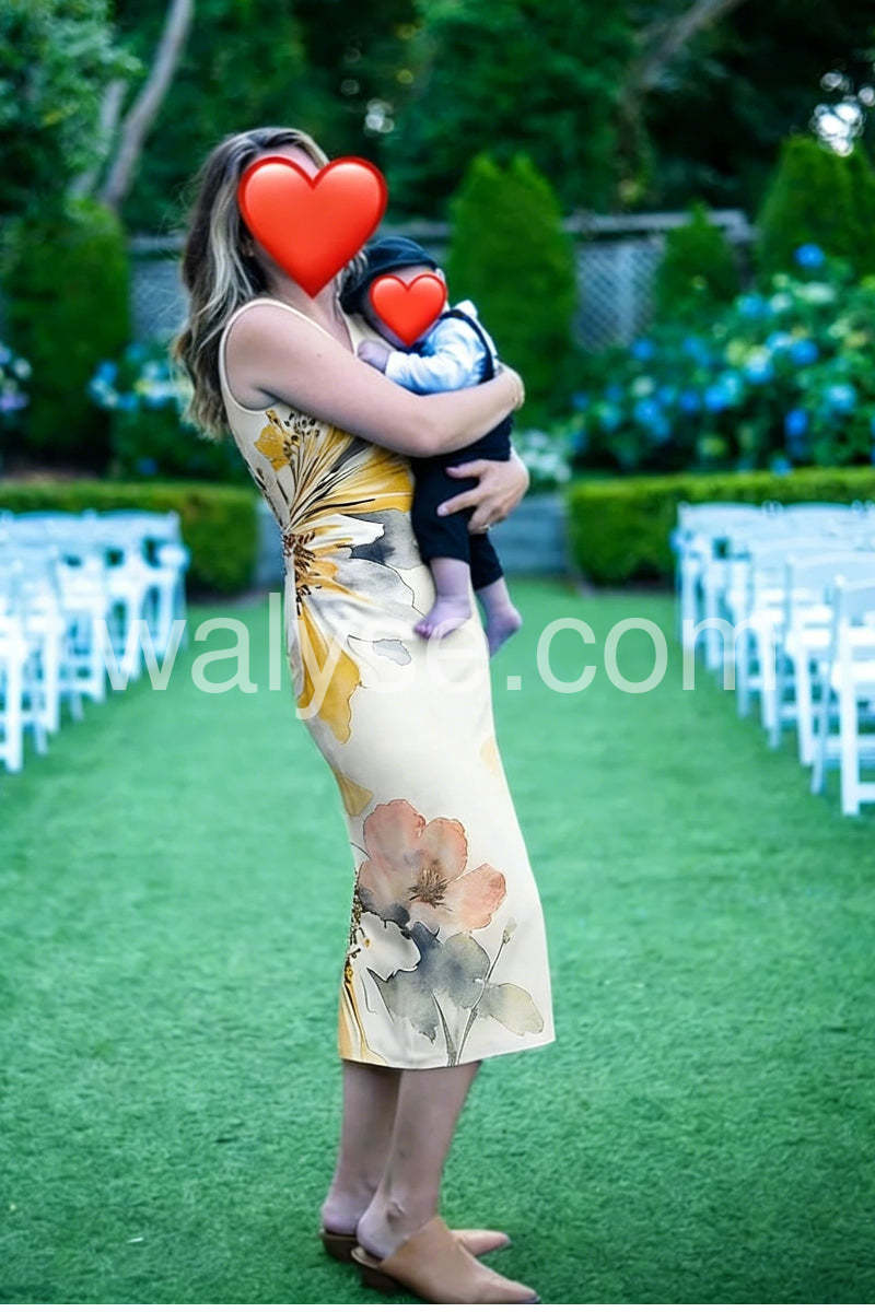 Exude timeless elegance in this Watercolor Floral Sleeveless Midi Dress, a refined and flattering silhouette that blends artistry with modern sophistication. Crafted from smooth, high-quality fabric—likely satin or silk-blend—this dress features a soft cream base adorned with a large-scale watercolor floral print in warm hues of mustard yellow, blush pink, soft gray, and subtle green, creating a painterly effect that feels both luxurious and natural. The deep V-neckline adds a touch of allure, while the sleeveless design enhances its sleek, minimalist appeal. A form-fitting sheath cut hugs the body gracefully, accentuating curves and elongating the figure, with a mid-calf hemline that strikes the perfect balance between elegance and versatility. Paired here with statement earrings, a structured black clutch, and heels, it’s ideal for cocktail events, dinners, or upscale gatherings. This dress effortlessly transitions from day to evening, offering a look that’s both artistic and polished. Let its delicate floral motif and sophisticated silhouette make you the center of attention with quiet confidence and grace.