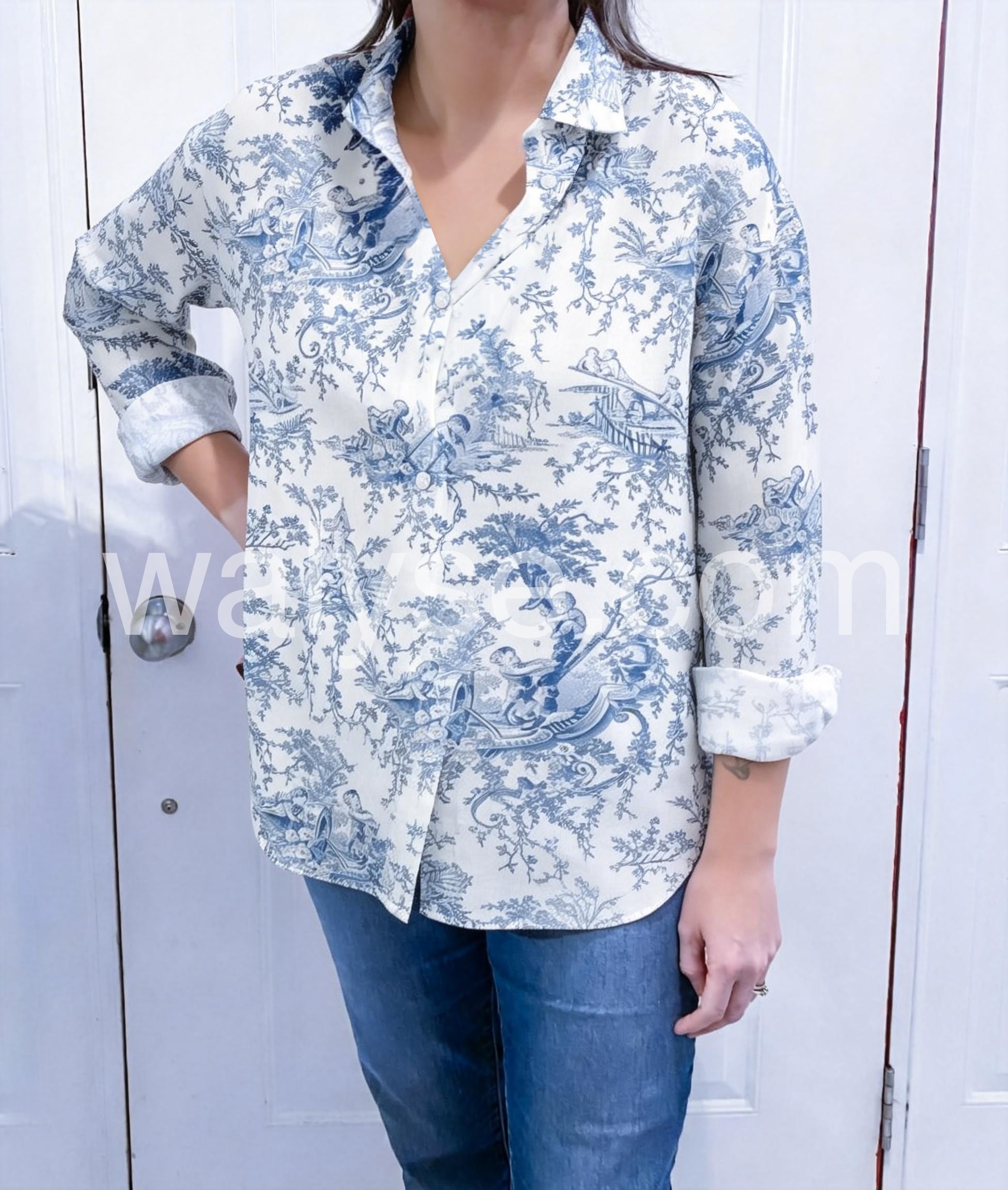 Elevate your wardrobe with this Romantic Blue Floral Print Button Down Shirt, a refined piece that blends vintage charm with modern sophistication. Crafted from lightweight, breathable cotton or cotton-blend fabric, this long-sleeve shirt features an elegant toile de Jouy print—featuring delicate blue pastoral scenes of trees, figures, and floral motifs on a crisp white background—inspired by traditional French design. The clean collar and full button-down front offer a polished look, while the slightly relaxed fit ensures comfort and ease. Roll up the sleeves for a casual, lived-in vibe or keep them down for a more tailored appearance. Perfectly paired with jeans, denim shorts, or high-waisted trousers, it’s ideal for brunch dates, weekend outings, or office-to-evening transitions. Inspired by the curated, effortlessly chic styles found on Lulus.com, this blouse brings timeless elegance to any outfit. A must-have for those who love classic patterns, subtle romance, and wearable artistry. Let this shirt carry you through spring and summer with grace, style, and a touch of old-world charm.