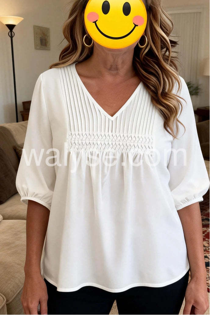 Elevate your everyday wardrobe with this timeless white V-neck top. Crafted from quality fabric, it offers a flattering silhouette that transitions seamlessly from casual to professional settings. The classic V-neckline provides a refined touch, while the plain design ensures versatile styling with virtually any piece in your closet. Perfect for layering or wearing solo, this essential staple delivers understated elegance and reliable comfort for year-round wear.
