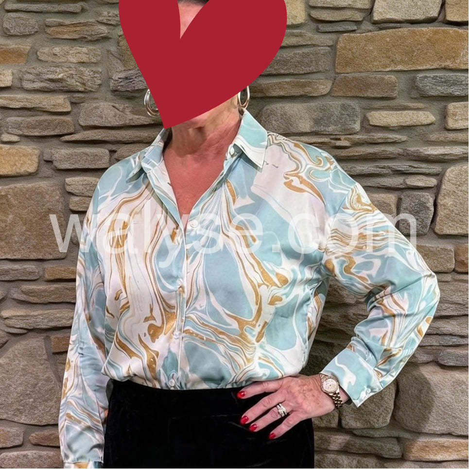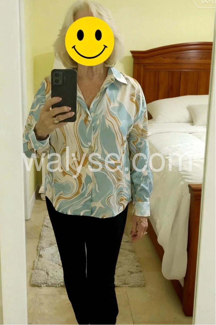 Absolutely love this blouse! The marble pattern is so unique with the light blue and gold tones. It feels like silk against the skin and looks incredibly expensive. I wore it to the office and received so many compliments. Fits true to size.