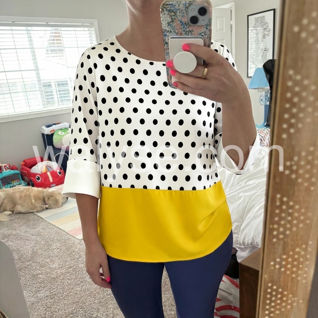 Absolutely love this top! The color block design is so unique. The polka dots give it a fun retro vibe, while the yellow bottom adds such a happy pop of color. It fits true to size and the material is very soft.