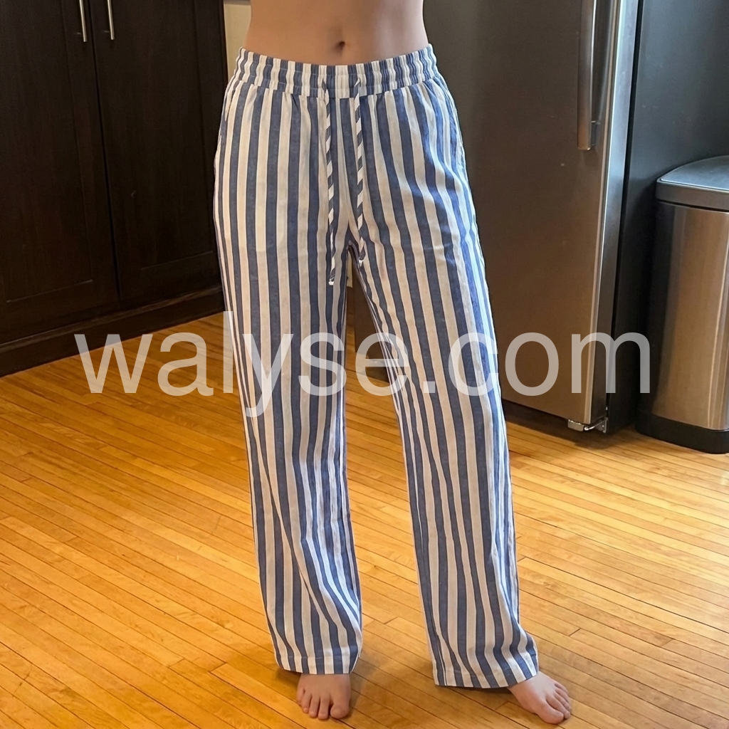 These relaxed-fit pants feature bold vertical stripes in navy and white. Elastic waistband with drawstring for comfort. Wide-leg design and lightweight fabric perfect for summer. Ideal for beach outings or casual wear. Effortlessly stylish and breezy.