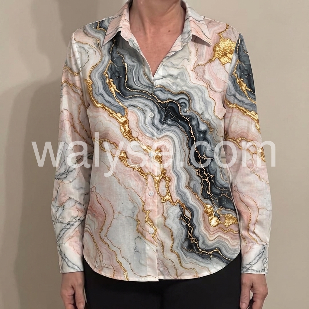 Stunning shirt! The pink and grey marble effect is gorgeous. It is surprisingly versatile, I have worn it with black slacks for a meeting and with distressed jeans for a date night. Love it!