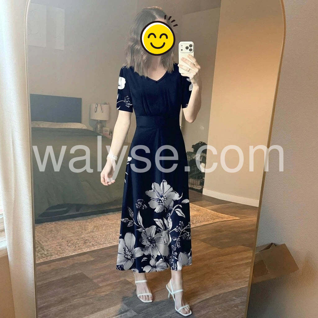 I bought this dress for a Mediterranean cruise and it was absolutely perfect! The navy blue and white floral pattern is so elegant. The material is lightweight and breathable, which was great for the hot weather. It barely wrinkled in my suitcase. Highly recommend for any summer vacation!