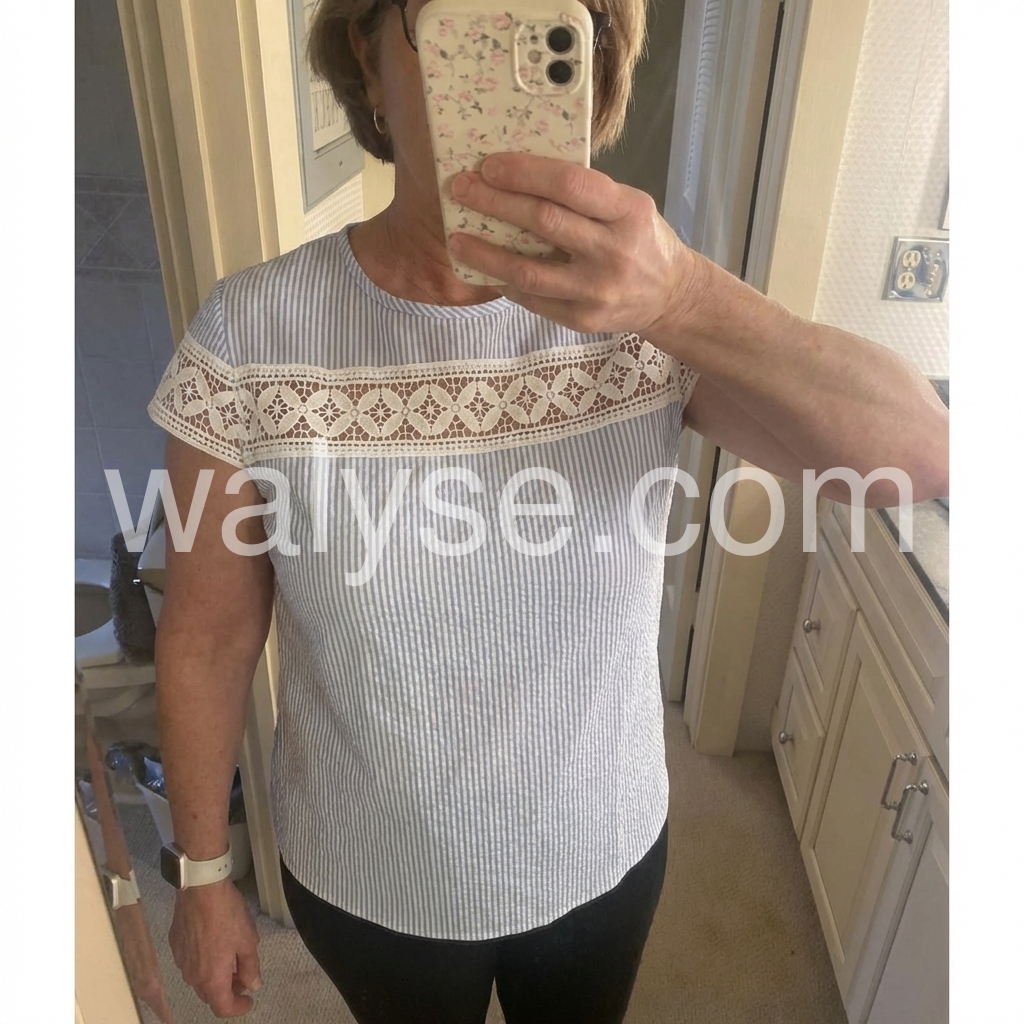 This short-sleeve top features a delicate white lace panel across the chest and sleeves. Made from soft, textured fabric with vertical stripes for a subtle pattern. Perfect for casual summer days or beach outings. Pair with shorts or jeans for a stylish look. Effortlessly chic and breathable.