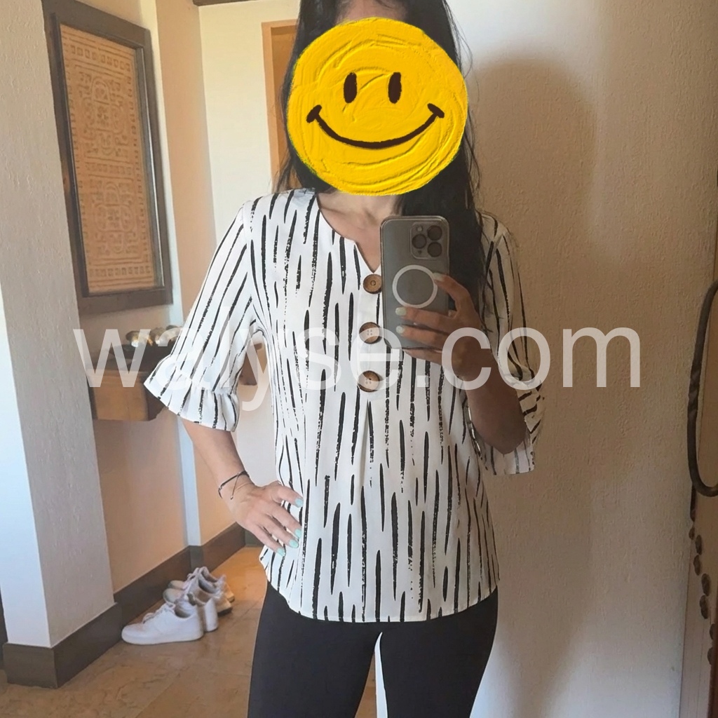 This loose-fitting top features a bold black abstract stripe print on white. V-neckline with wooden buttons down the front. Three-quarter sleeves with ruffled cuffs for a feminine touch. Lightweight and breathable, perfect for casual wear. Easy to pair with jeans or pants.
