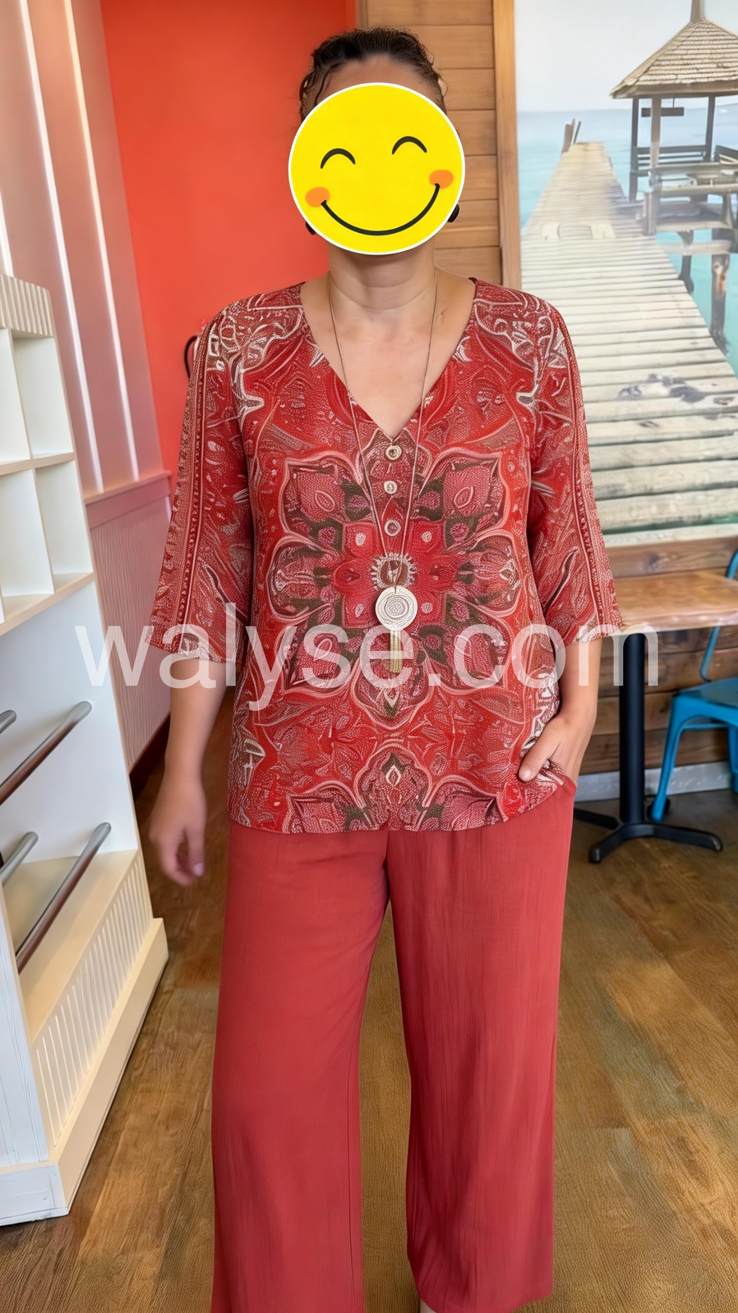 This coordinated set features a V-neck top with a bold mandala print and matching solid wide-leg pants. The relaxed fit ensures all-day comfort. Soft fabric perfect for warm weather. Ideal for casual outings or stylish days out. Effortlessly chic with a bohemian flair.