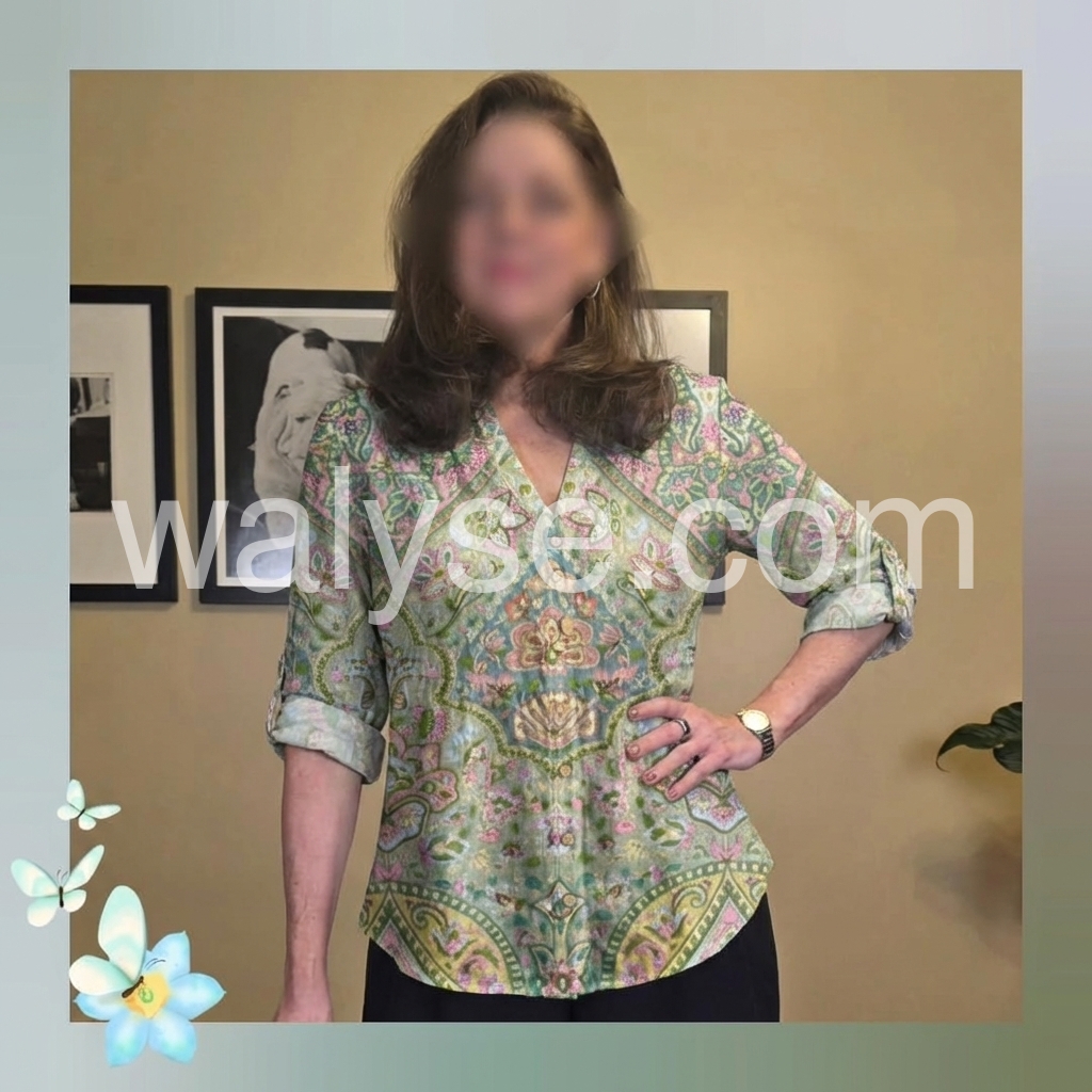 This blouse has a nice print on it and the fabric is soft and flowy. I ordered a size small as suggested on the size chart. It’s an okay casual or semi-casual blouse that can be paired with jeans or dressed pants.