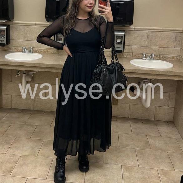 Absolutely in love with this dress! The sheer mesh sleeves give it such a cool, edgy vibe without being too revealing. I wore it to a concert with chunky combat boots just like the model, and it looked incredible. The material is surprisingly soft and flows beautifully when you walk.