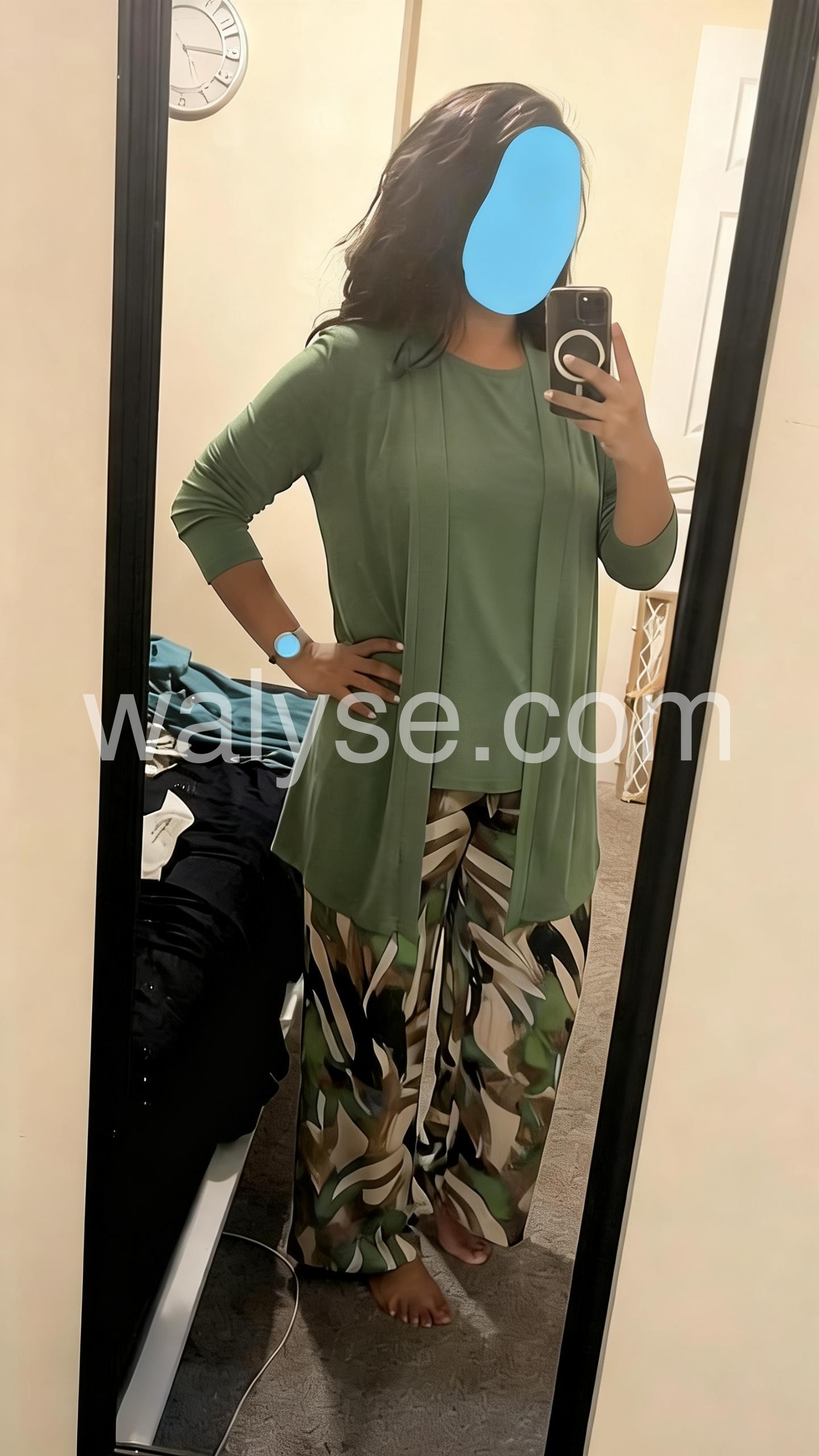 Perfect for spring and early fall! The earth-tone print on the pants is vibrant and matches the sage green top perfectly. It feels like wearing pajamas but looks chic.
