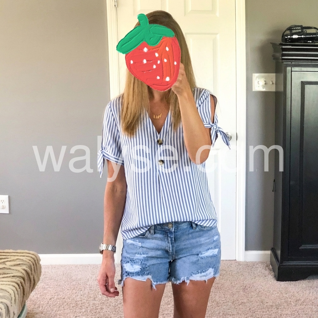 Absolutely love this top! The vertical stripes are so flattering and the little ties on the sleeves add such a cute detail. It fits perfectly and looks great with jeans. Very lightweight and perfect for summer.