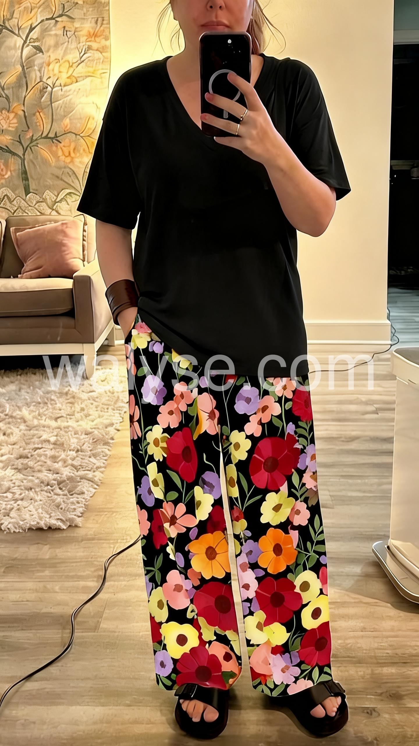 I absolutely love this set! The wide-leg floral pants are incredibly comfortable and breathable, perfect for summer weather. The best part? They have pockets! The black V-neck top is simple but pairs so well with the vibrant bottoms. Highly recommend!