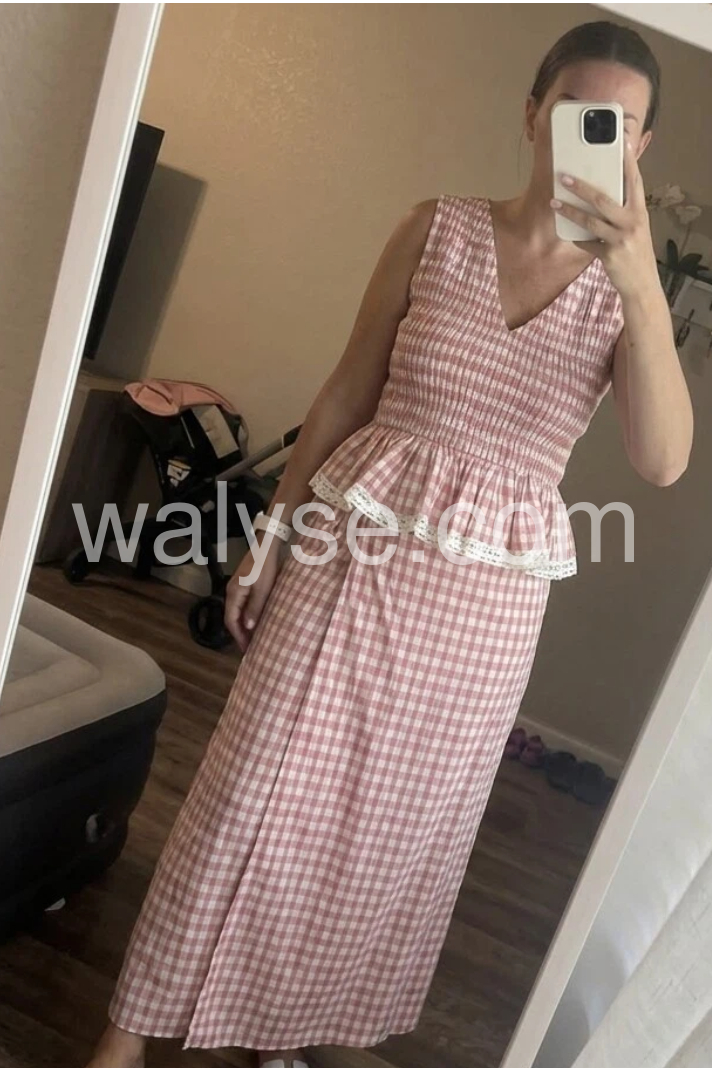 This two piece sleeveless maxi dress features a classic pink and white checkered pattern. With a V-neckline, smocked waist, and flared peplum detail for a flattering fit. The lightweight fabric is perfect for warm days. Ideal for casual outings or garden parties. Timelessly charming and easy to style.