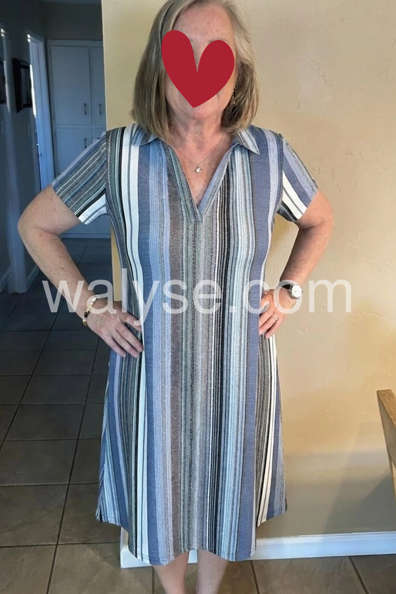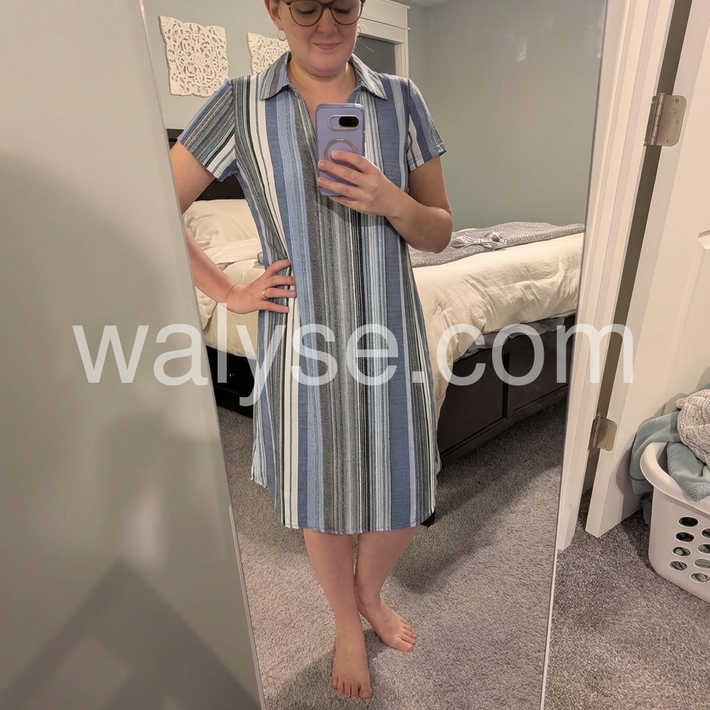 Absolutely love this dress! The vertical stripes are so flattering and slimming. The material is lightweight and perfect for hot summer days. It fits true to size and the V-neck with the collar gives it a nice polished but casual look. Highly recommend!