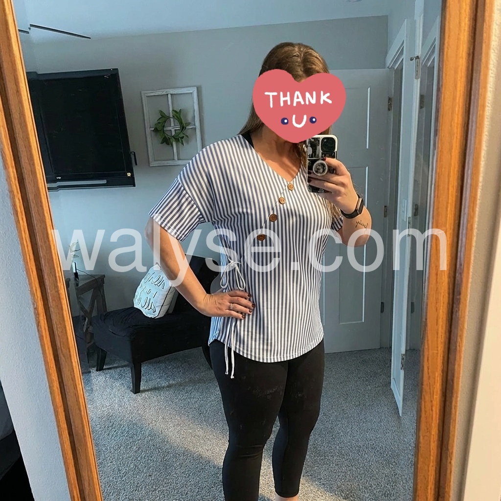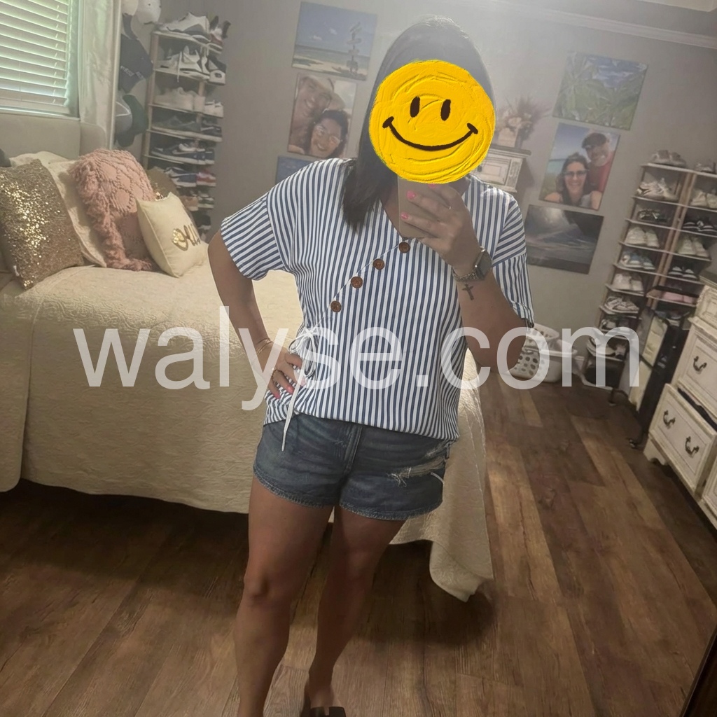 Absolutely love the unique button detail on this top! The asymmetrical design is super flattering and the blue stripes give it a fresh, nautical vibe. It fits true to size and hides my tummy perfectly. Highly recommend!