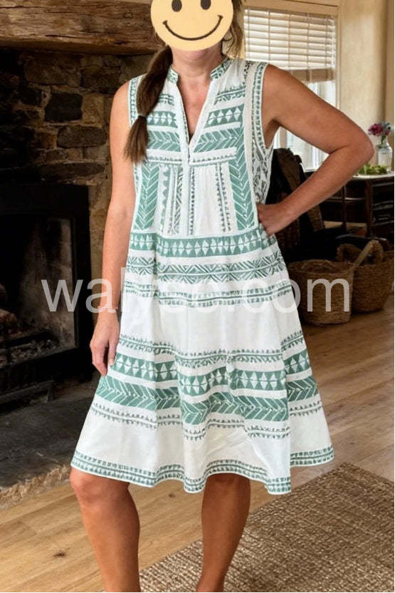 Absolutely love this dress! The green geometric pattern is so cute and perfect for summer. It is incredibly lightweight and airy making it my go-to for hot days.