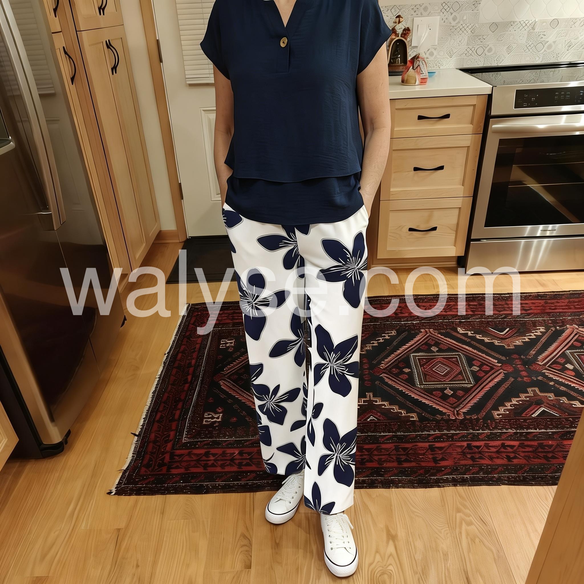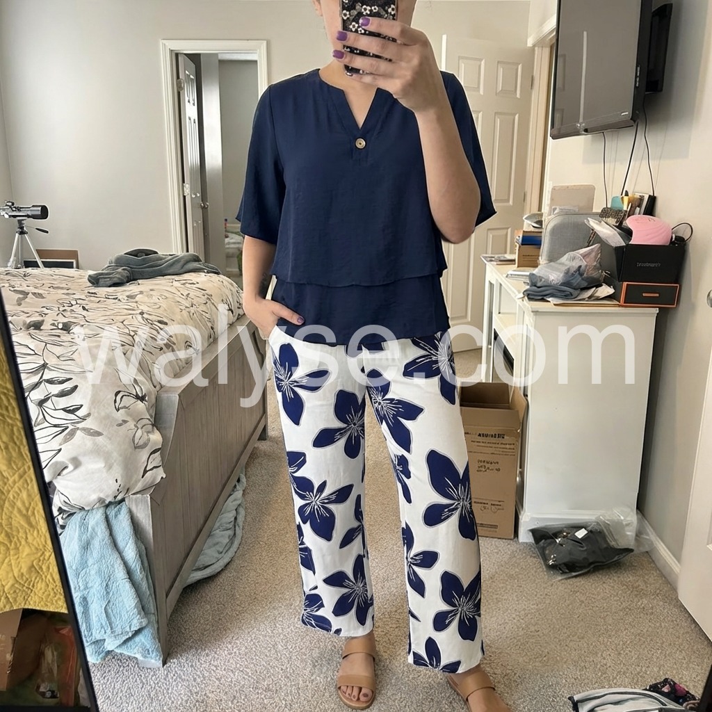 This outfit is a head-turner. The contrast between the solid dark blue top and the bold flower pattern on the pants is stunning. It feels like high-end boutique clothing but at a fraction of the cost. Super comfy for all-day wear.