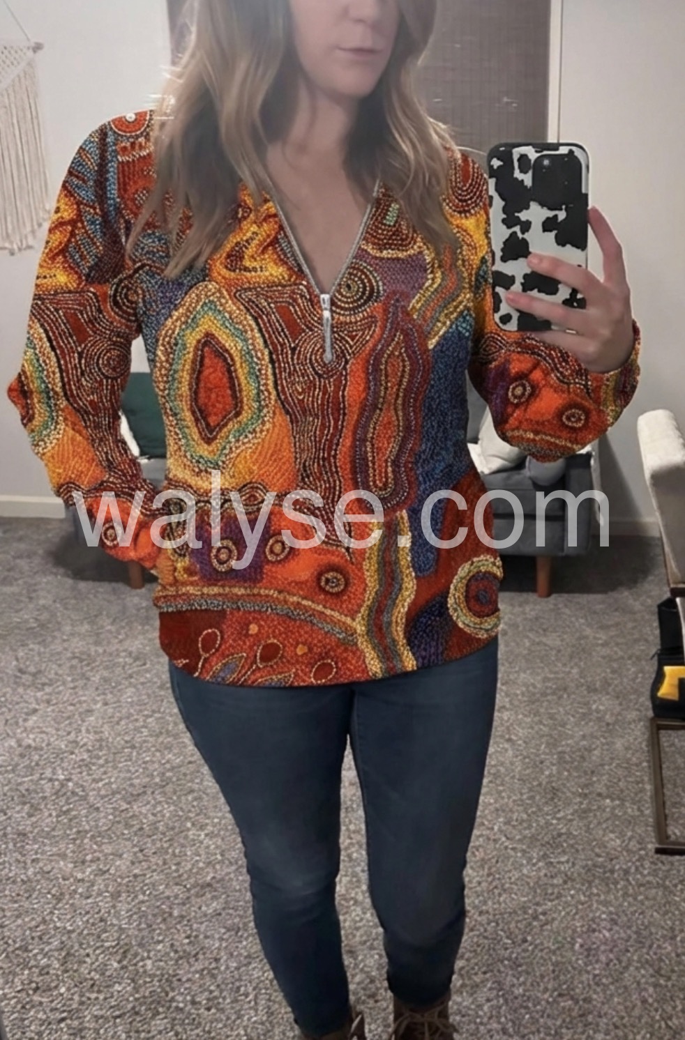 Zip it up with this autumn color casual top, featuring red, orange, blue, and yellow geometric swirls and bead print patterns. The long fitted sleeves, zippered plunging v-neckline, and waist-length silhouette give this laid-back top just the right amount of detail. Finish your look with silver or gold jewelry, jeans, and a cami underneath. Machine wash cold tumble dry low to medium heat. Iron if needed or lay flat to dry.