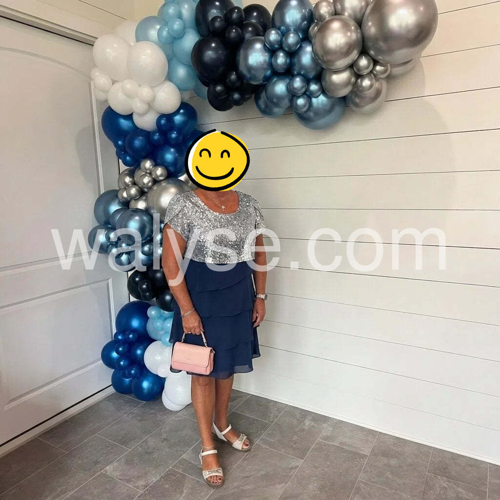 I wore this dress to a friends' reunion and was blown away by how versatile it looks. The top portion has a subtle gray speckle that transitions into a rich navy blue tiered skirt, which gives the outfit real movement and depth. The flutter sleeves are flattering on my arms, and the length hit right at the knee for a balanced, elegant silhouette. I paired it with a light pink purse like in the photo and some simple gold jewelry, which made the whole look feel polished without being overdone. Comfort-wise, the fabric is breathable and the layers don't cling, so I could move around easily all evening.