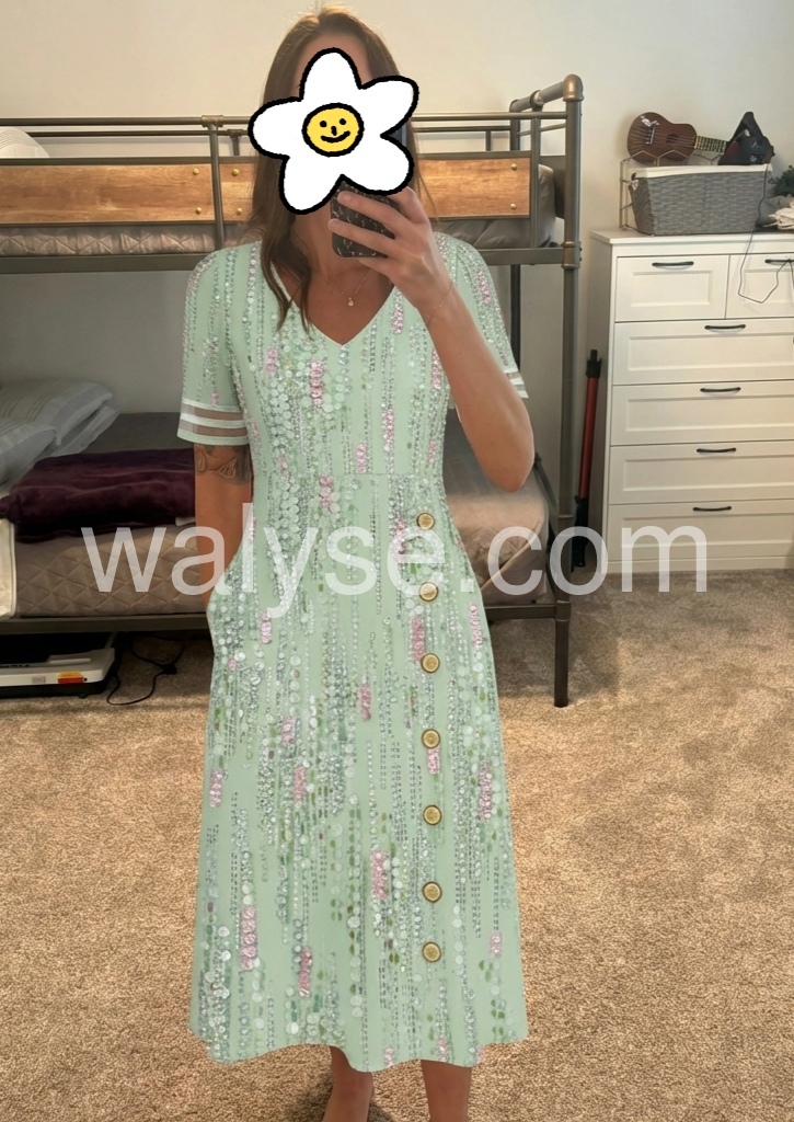 This midi dress is a celebration of feminine glamour. The V-neck, side button placket, and pockets create a flattering, practical silhouette, perfect for special events.