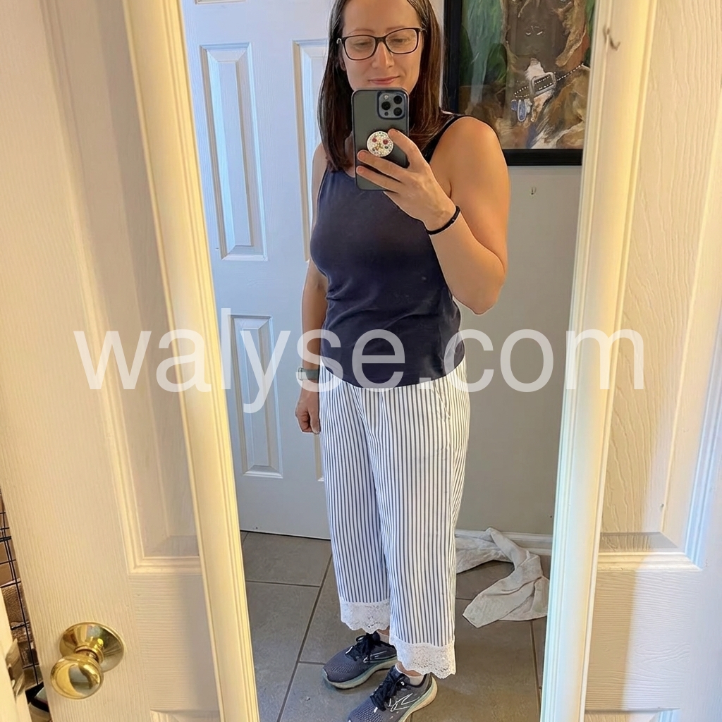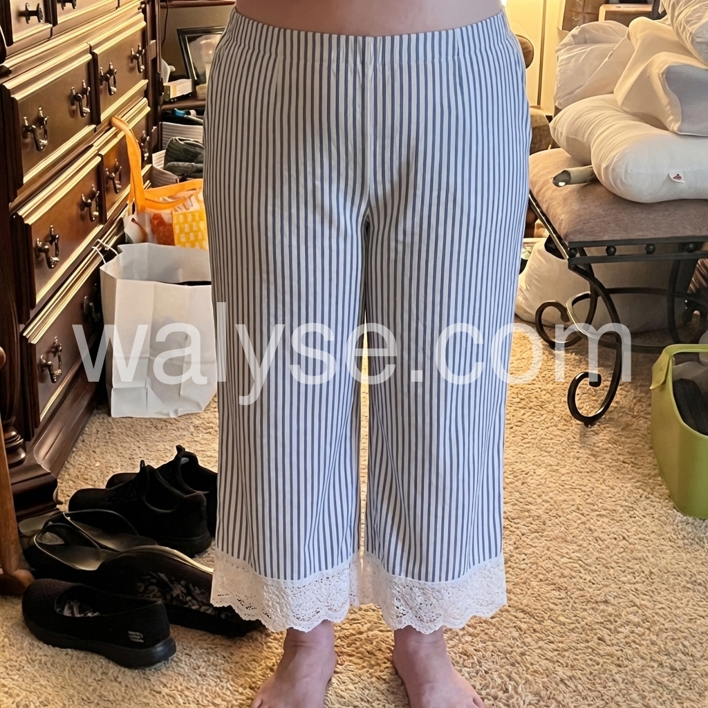 These relaxed-fit pants feature vertical blue and white stripes with a delicate lace trim at the hem. Elastic waistband and side pockets for comfort. Lightweight fabric perfect for warm weather. Ideal for beach days or casual outings. Effortlessly stylish and breezy.