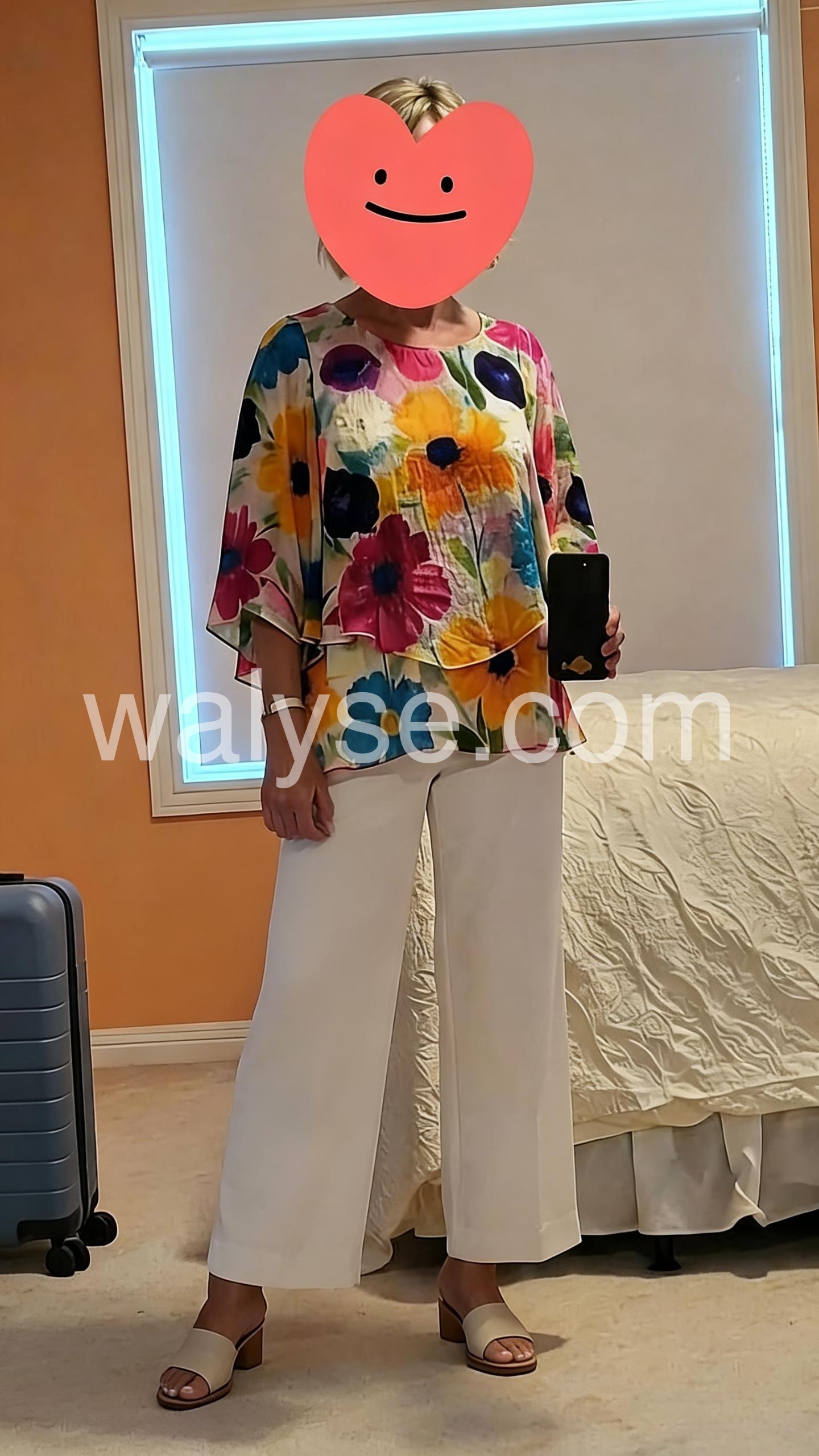Absolutely love this two-piece set! The floral print is so vibrant and perfect for my upcoming cruise. The layered top hides my tummy perfectly, and the white pants are crisp and comfortable. Highly recommend!