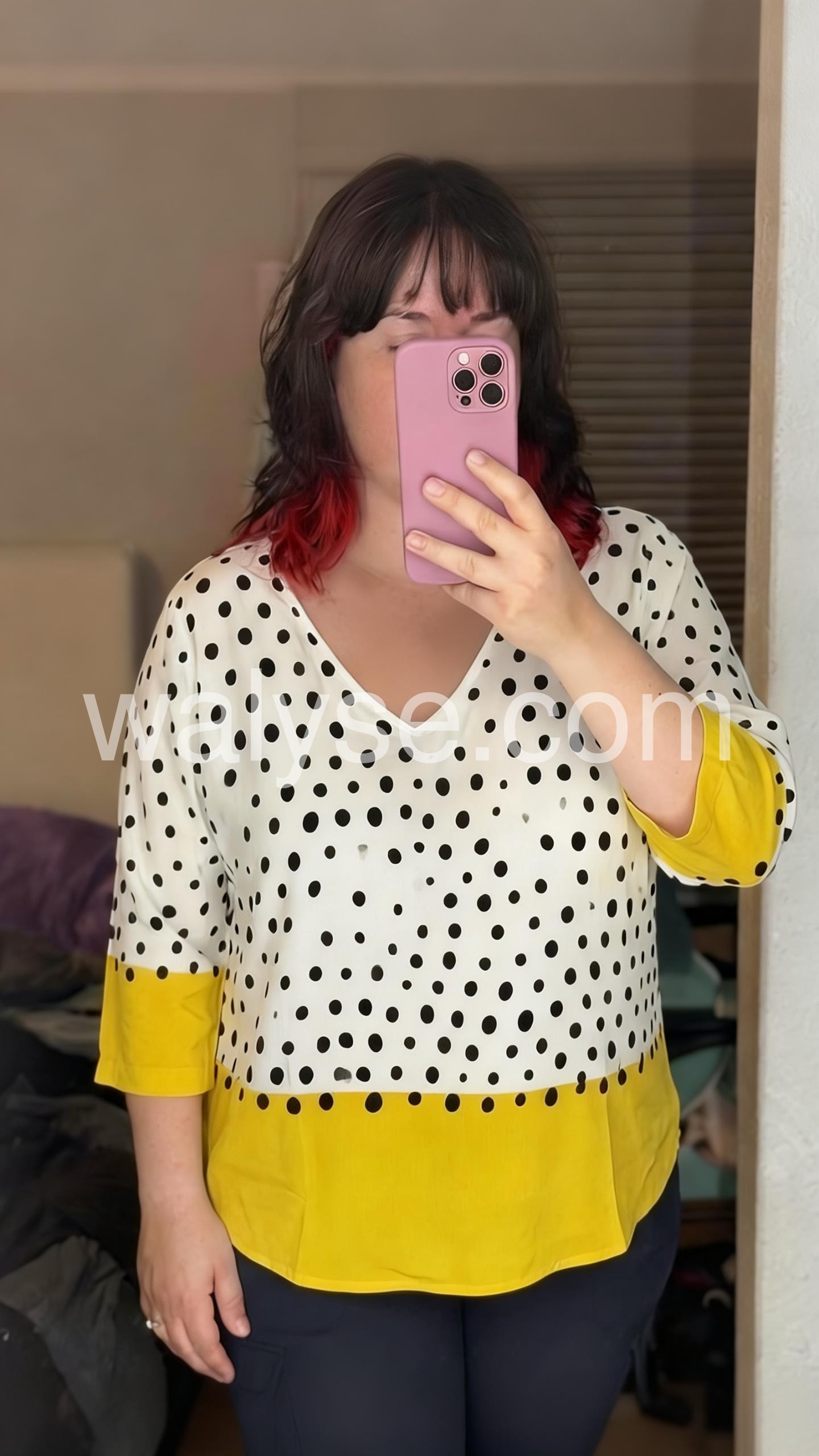 This relaxed-fit top features a white base with black polka dots and a vibrant yellow hem. V-neckline and three-quarter sleeves with rolled cuffs. Lightweight fabric for comfort and style. Perfect for casual wear or adding a pop of color to your outfit. Effortlessly trendy and easy to pair.