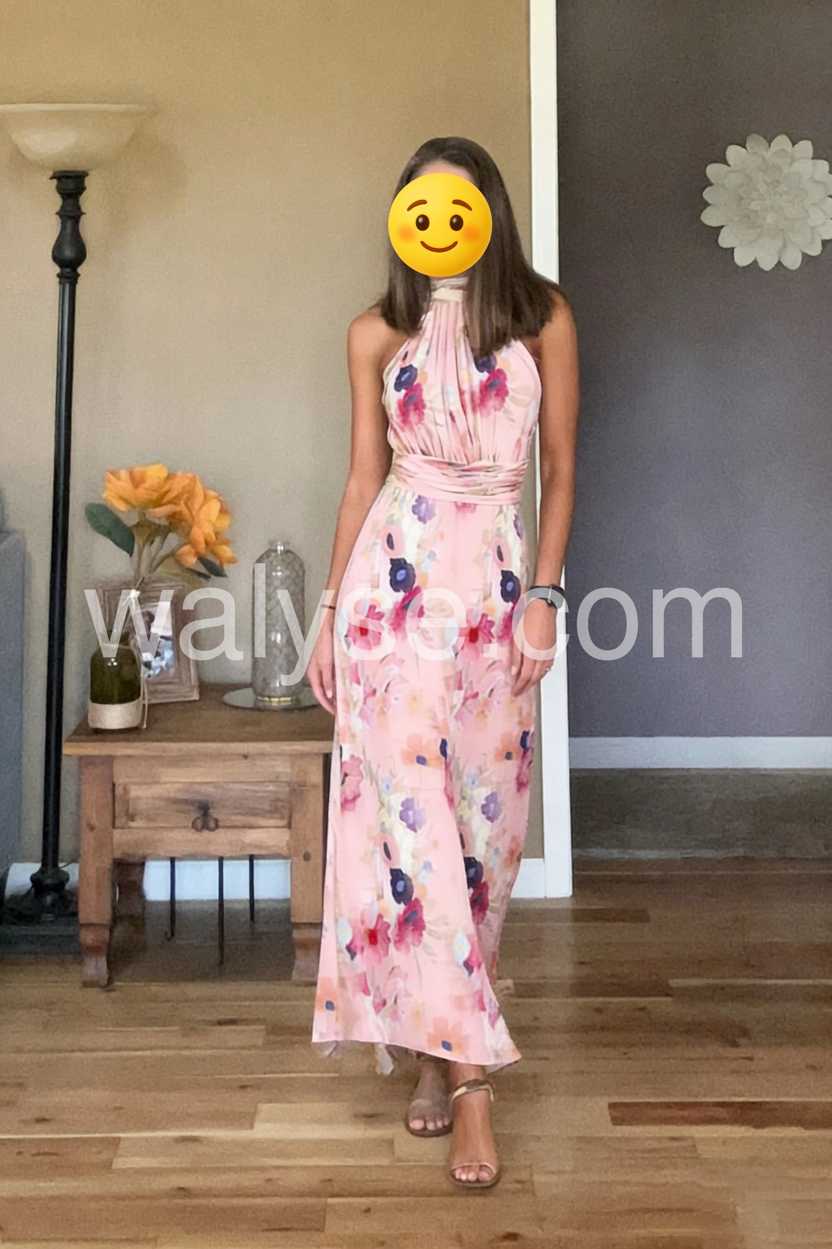 This halter-neck maxi dress features a soft pink base with vibrant floral prints. The ruched neckline and fitted waist highlight the silhouette. Lightweight fabric drapes beautifully for movement. Perfect for formal events or summer soirées. Effortlessly chic and feminine.